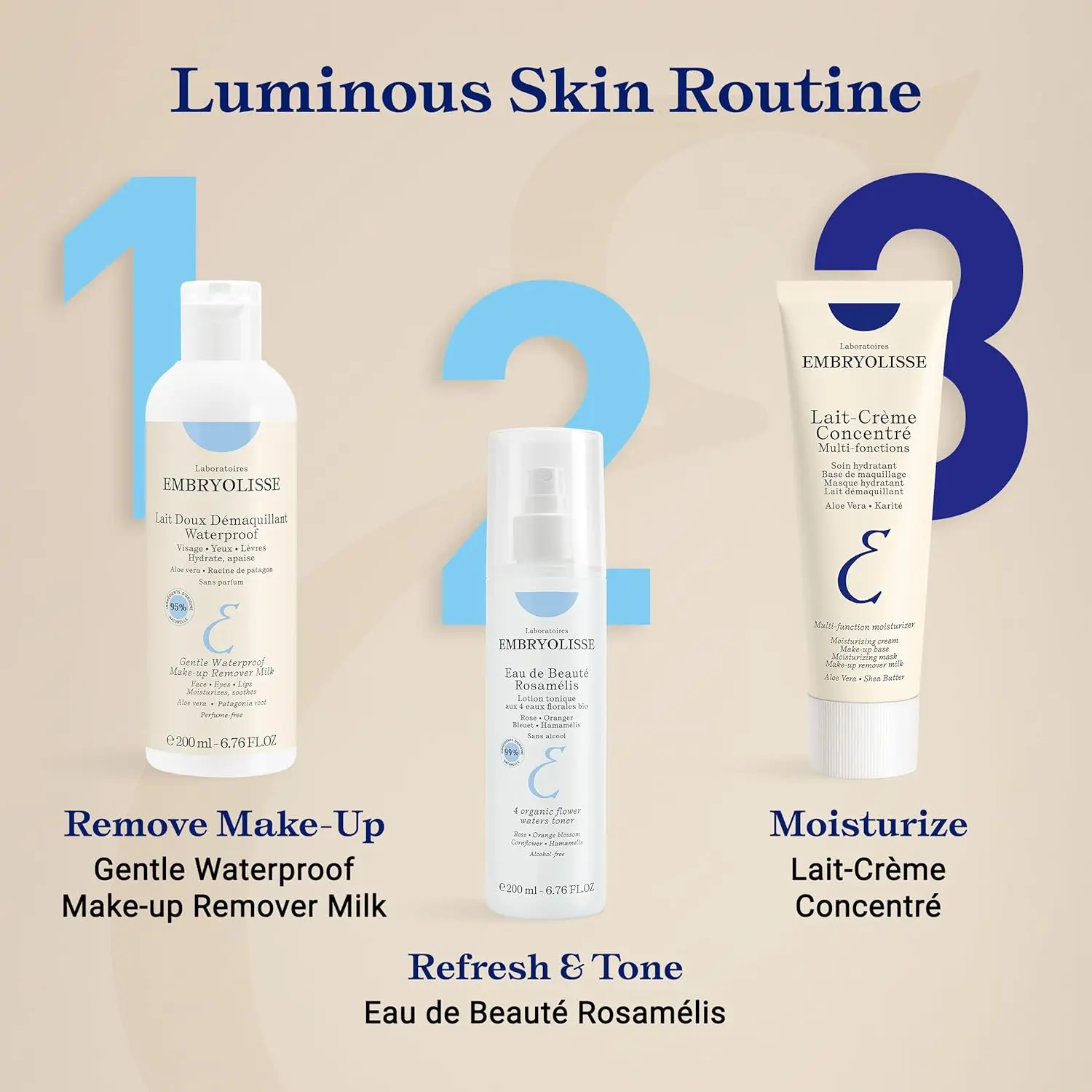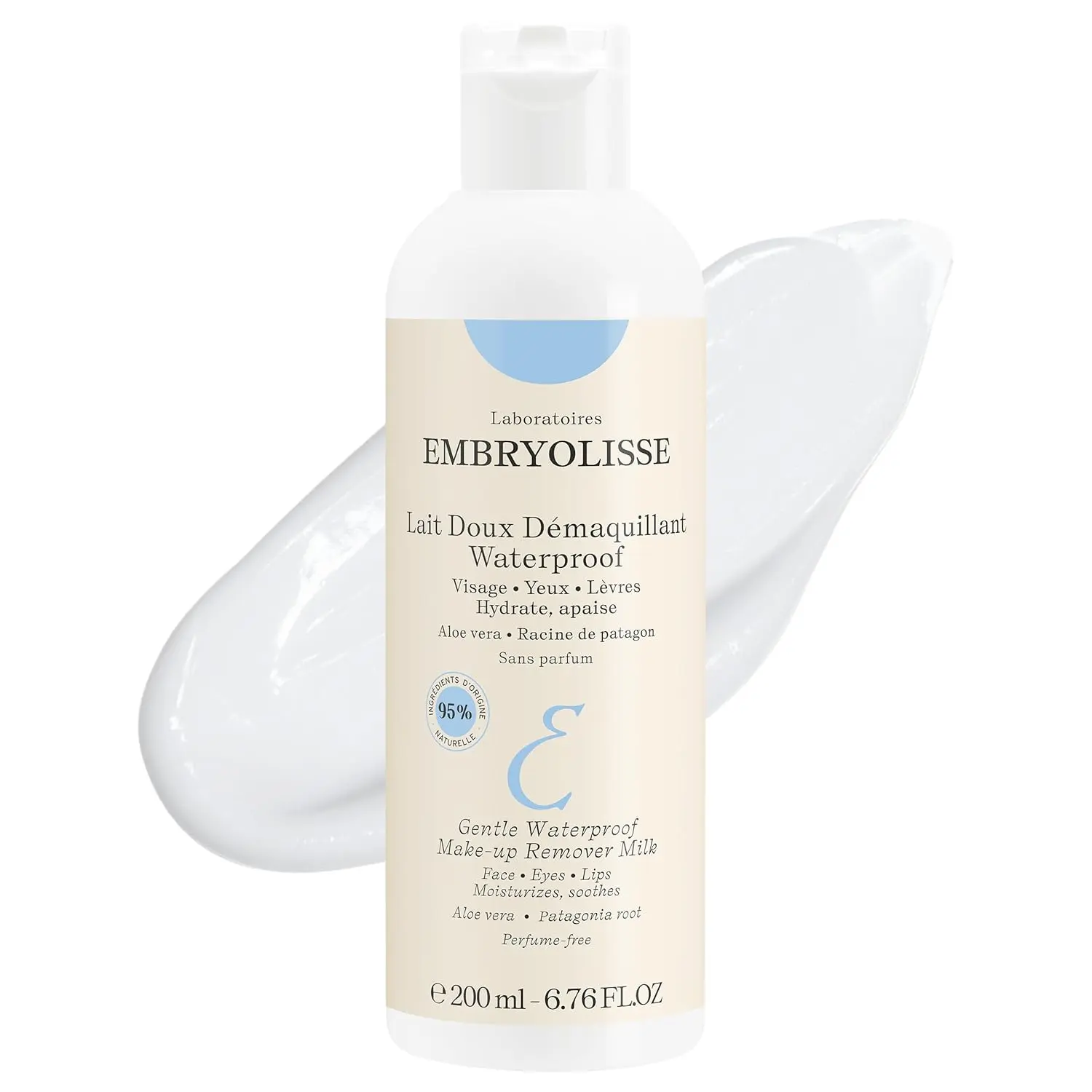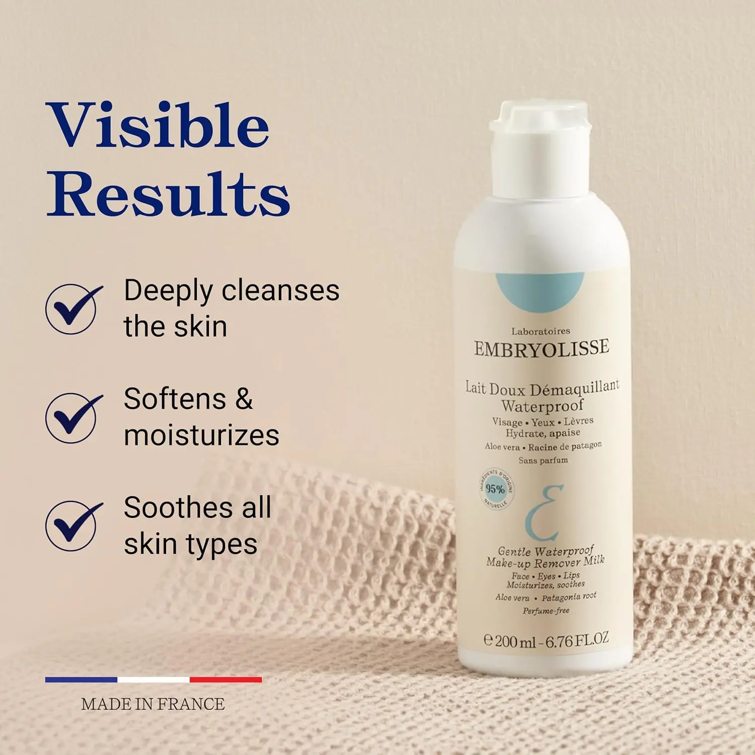 Embryolisse Gentle Waterproof Make-up Remover Milk is a 4-in-1 essential that removes waterproof makeup, cleanses, moisturizes, and soothes in one step. Enriched with Aloe Vera, Shea Butter, and Patagonia Root, this formula lifts impurities while keeping skin feeling refreshed. Designed for all skin types, including sensitive skin, it contains 95% naturally derived ingredients for a comforting cleansing experience.