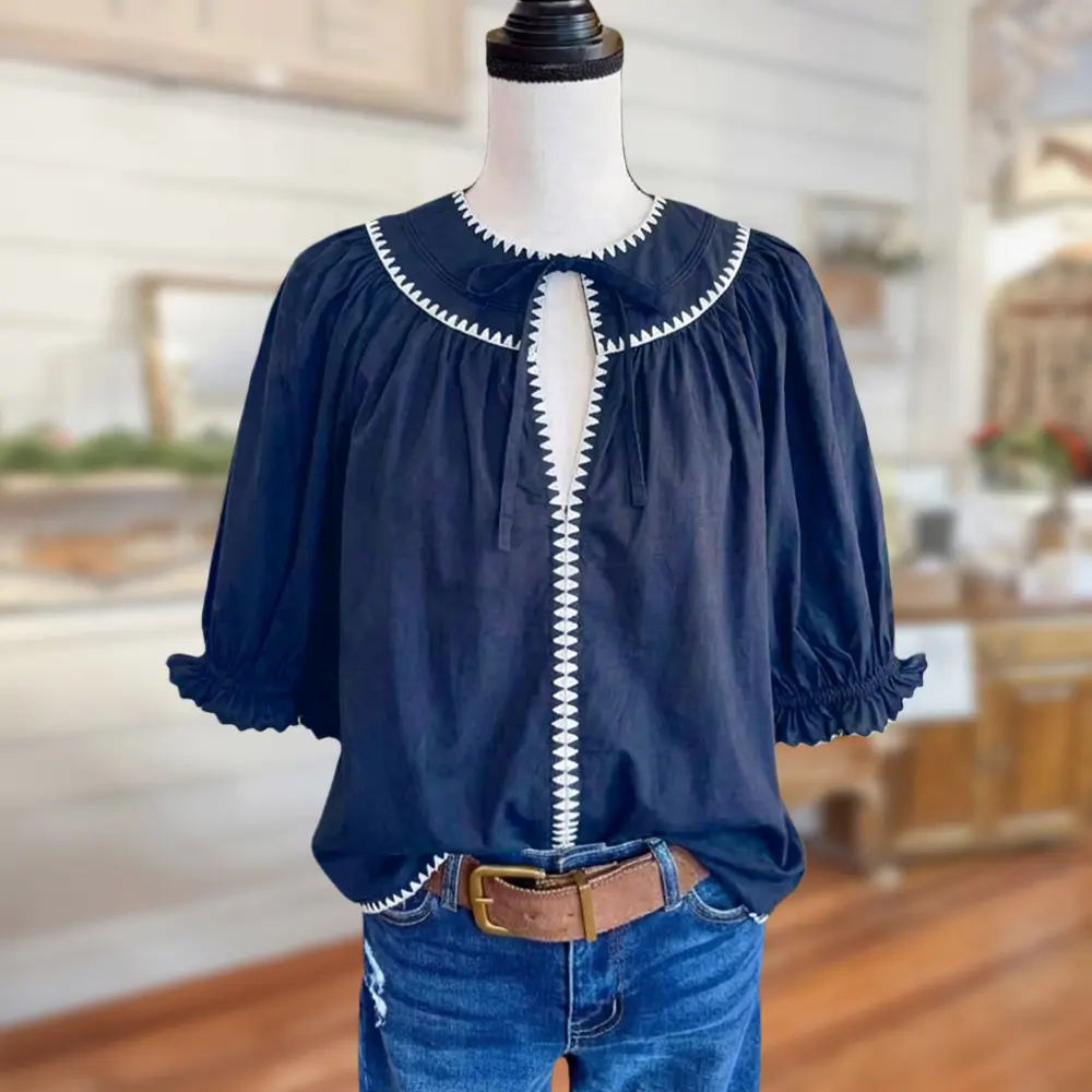 · Timeless elegance – The navy blue and white embroidery never goes out of style.