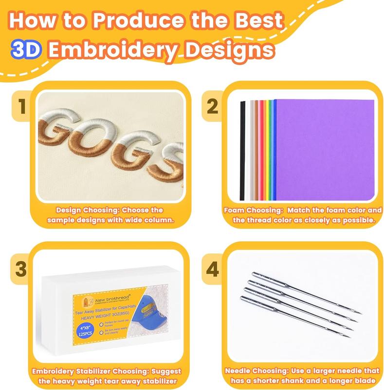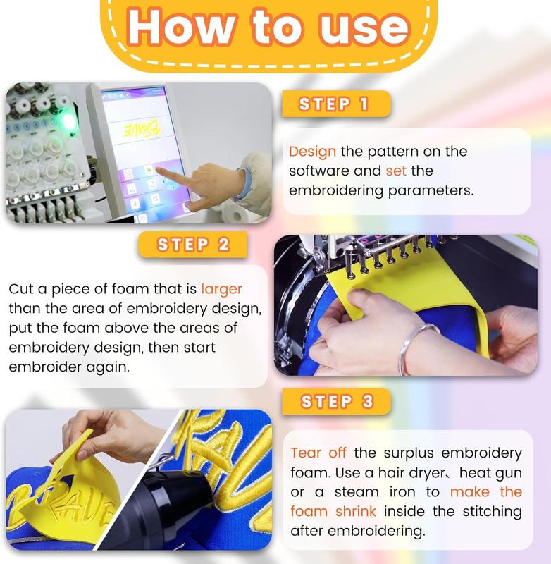 This large size 3MM foam creates a 3D embroidery effect for caps, garments, jackets, bags, backpacks, and more. Perfect for adding depth and texture to your projects. The foam is versatile and easy to use for various applications.