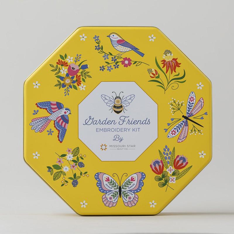 Celebrate the beauty of spring anytime with the Garden Friends Embroidery Kit! Inspired by the wonders of nature, this delightful kit features charming designs of birds, bees, butterflies, ladybugs, and flowers, ready to be threaded to life. Watch it all bloom before your eyes as you transform quilts, pillows, tote bags, tea towels, home decor, and more into stunning works of art! Inside the special octagon tin, you’ll find detailed instruction cards and all the materials needed to get creative. Whether you’re just beginning your embroidery journey or a seasoned stitcher looking for something new, this kit is the perfect set for you. This special package also includes the Missouri Star Garden Friends Honeycomb Quilt Pattern!Kit includes: