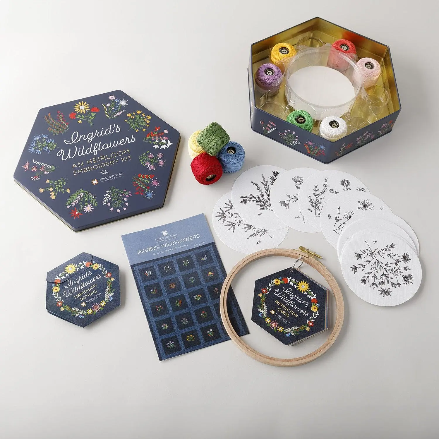 Inspired by the wildflower denim squares embroidered by Jenny's grandmother and later pieced into a nostalgic quilt, the Ingrid's Wildflowers Heirloom Embroidery Kit by Missouri Star will take you on a magical hand-stitching journey! Inside is everything you need to stitch your own embroidered blossoms. The kit includes 20 wildflower preprinted Peel and Stitch Washaway embroidery sheets, 20 wildflower instruction cards, 10 balls of 10oz Perle Cotton embroidery floss, 2 needles, 1 needle minder, 1 needle threader, embroidery scissors, and a 7" Beechwood embroidery hoop.