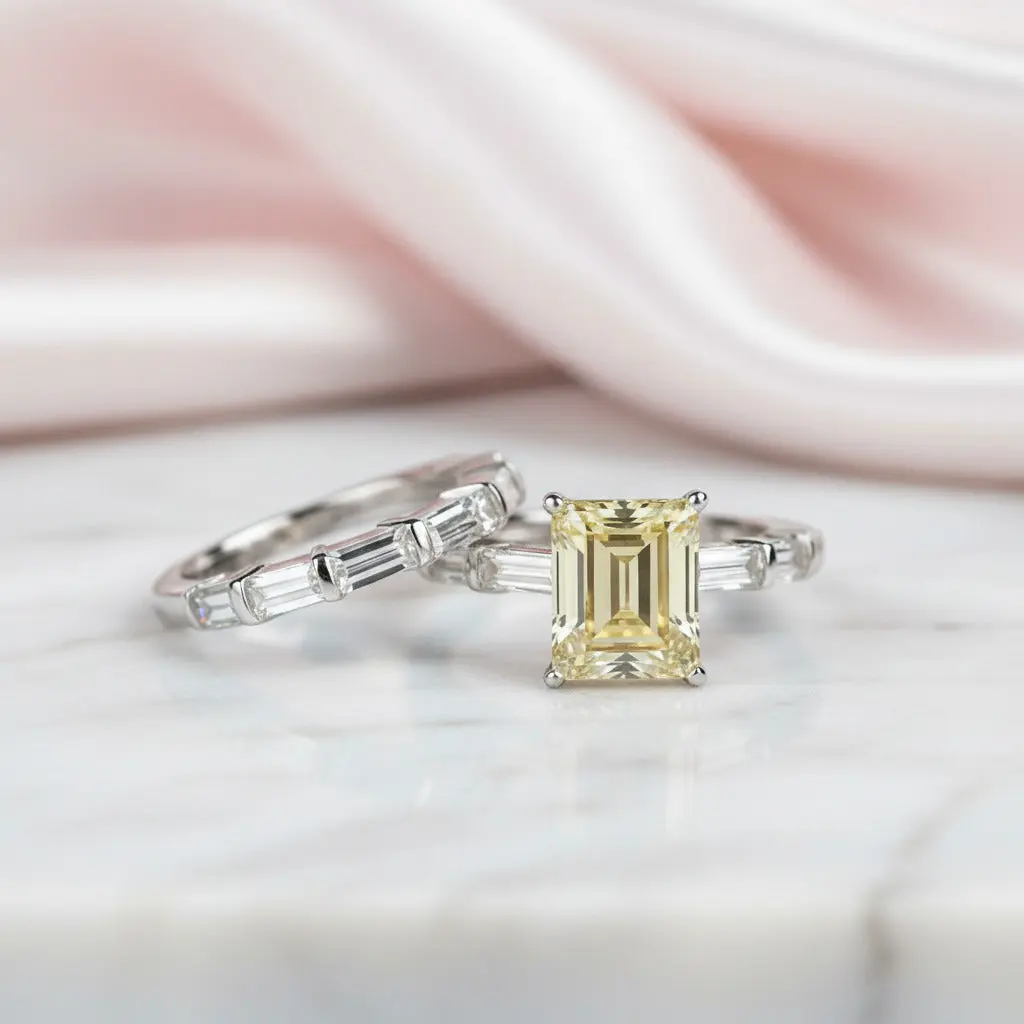 Make a statement with the Emerald Cut Ruby Vintage Wedding Ring Set by Black Diamonds New York. Crafted with high-quality rubies in a timeless emerald cut, this set is sure to dazzle on your big day. With its stunning design and affordable price, this ring set is the perfect choice for couples seeking a gorgeous and unique wedding ring option.