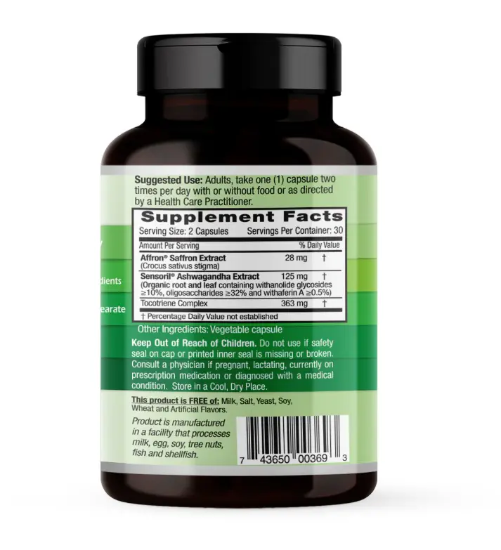 Ingredients"Affron Saffron Extract (Crocus sativus stigma) 28 mg + Sensoril Ashwagandha Extract (Organic root and leaf containing withanolide glycosides >10%,oligosaccharides >32% and withaferin A >0.5%) 125 mg + Tocotriene Complex 322 mg + Other Ingredients: Vegetable capsule (hypromellose,water)."