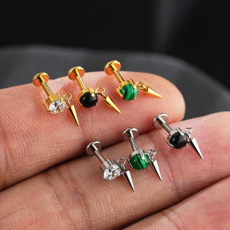 The spike helix piercing stud with a striking spike dangles below a stunning stone top, offering a unique combination of movement and shine. Perfect for helix, tragus, or conch piercings, this cartilage stud adds an element of bold sophistication to any look.