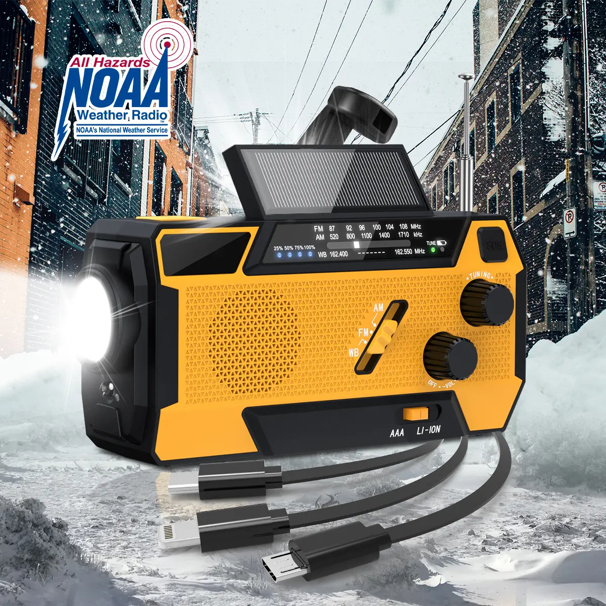 Seems to be a great one product. It's got a lot of features I am FM radio with weather solar powered got a flashlight on it and it's even can charge your phone and and it has multiple ways of power