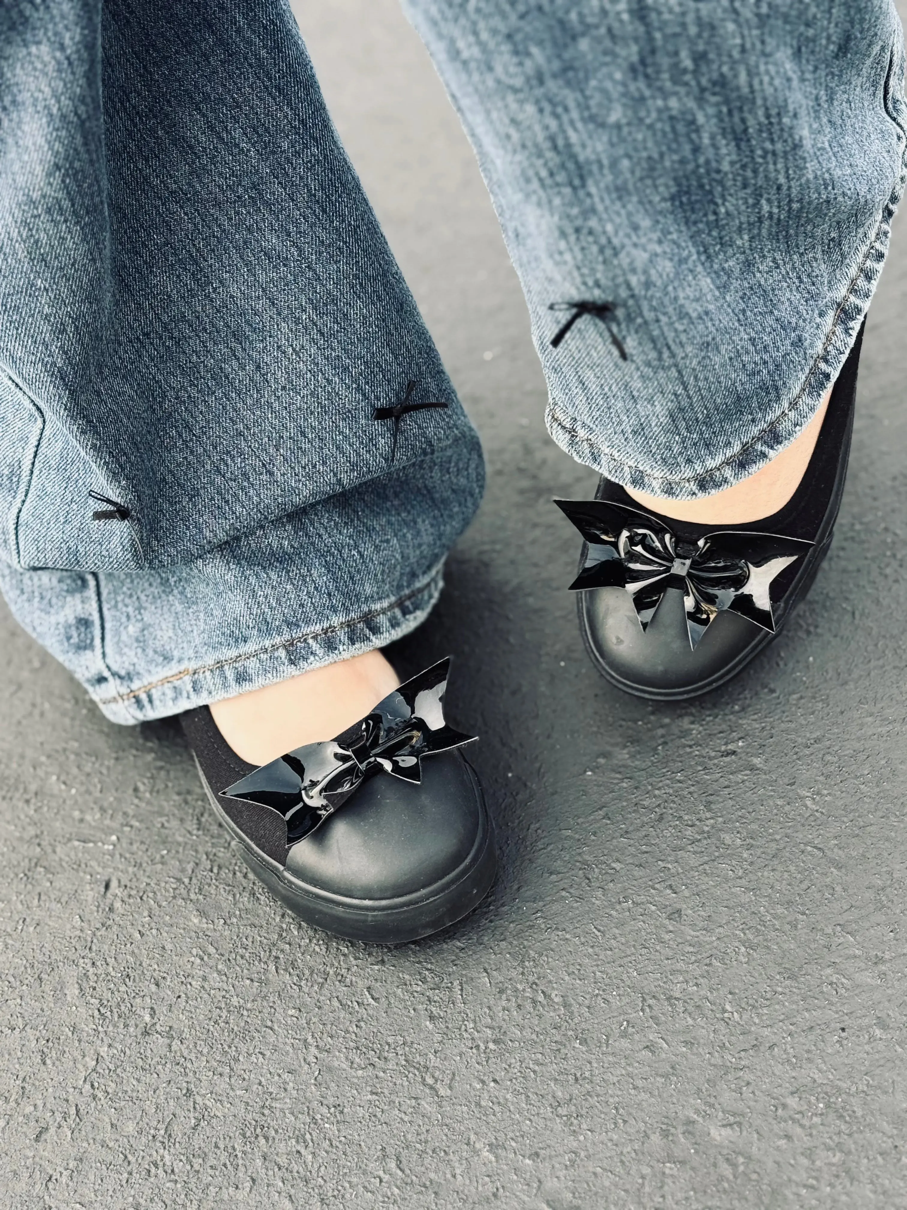 Treat yourself to a blast from the past with these goth coquette sneaker flats. Featuring a sleek black canvas upper with black patent bat shaped bow detail, these mid 2000's dream shoes are both edgy and comfortable. Finished with a black canvas lining and sock, and a black rubber outsole and toe cap.