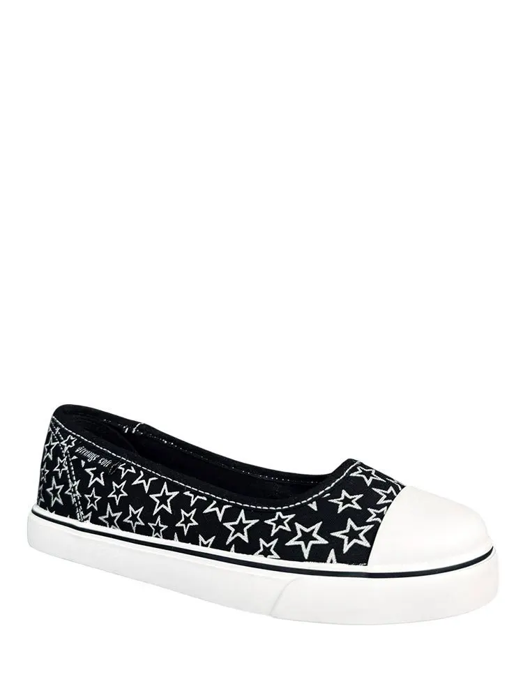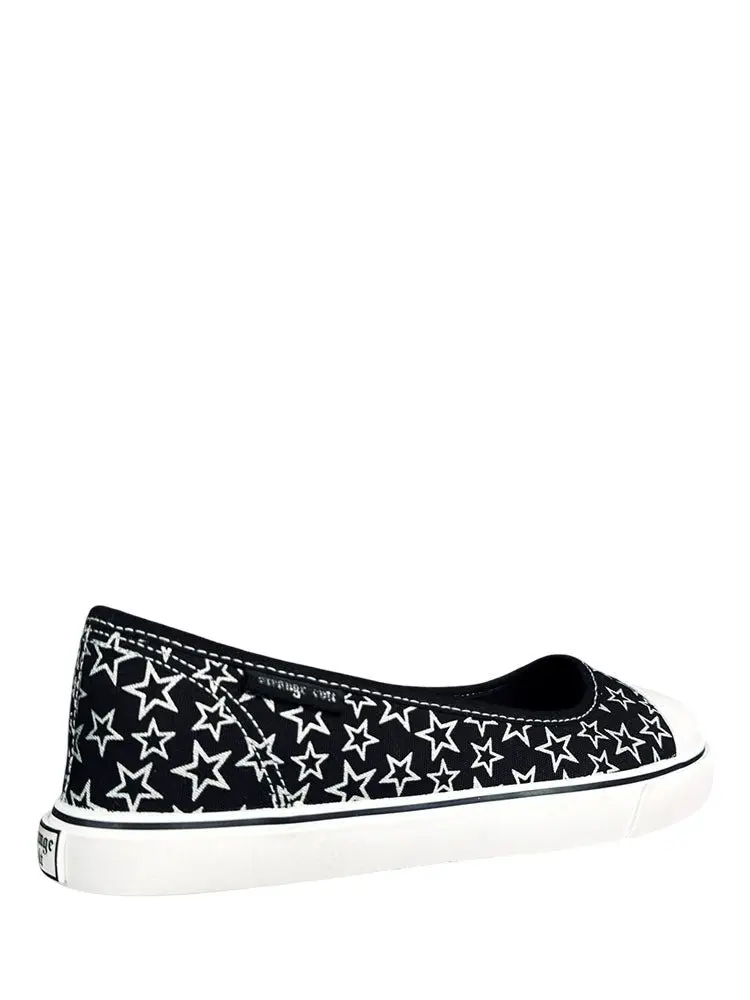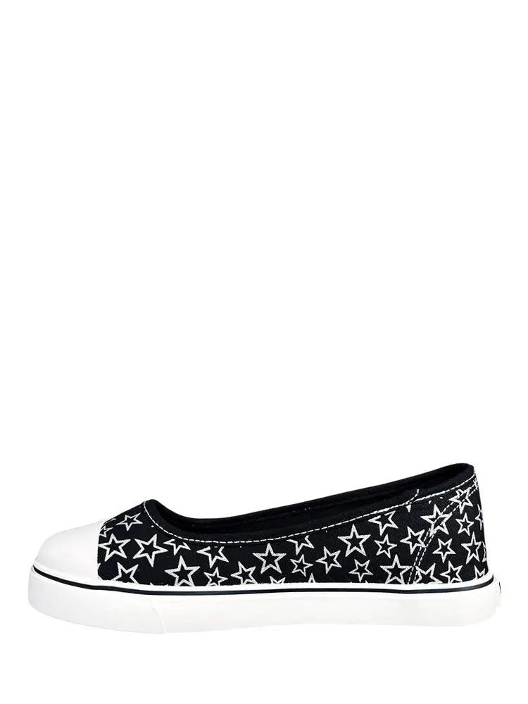Treat yourself to a blast from the past with these sneaker flats. Featuring a sleek black canvas upper with a printed white star detail, these mid 2000's dream shoes are both edgy and comfortable. Finished with a black canvas lining and sock, and a white rubber outsole and toe cap.