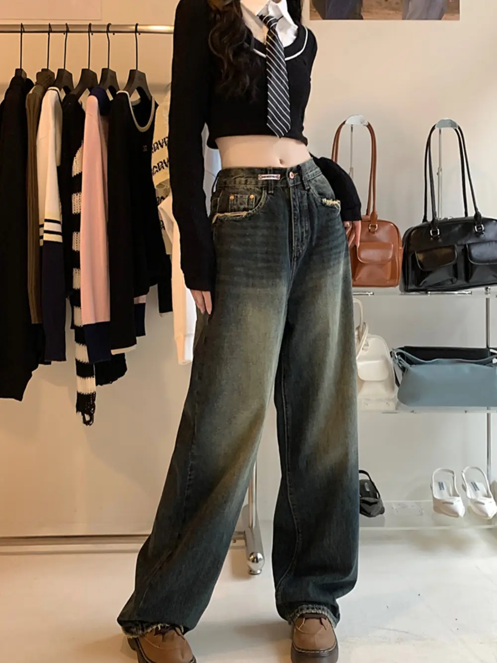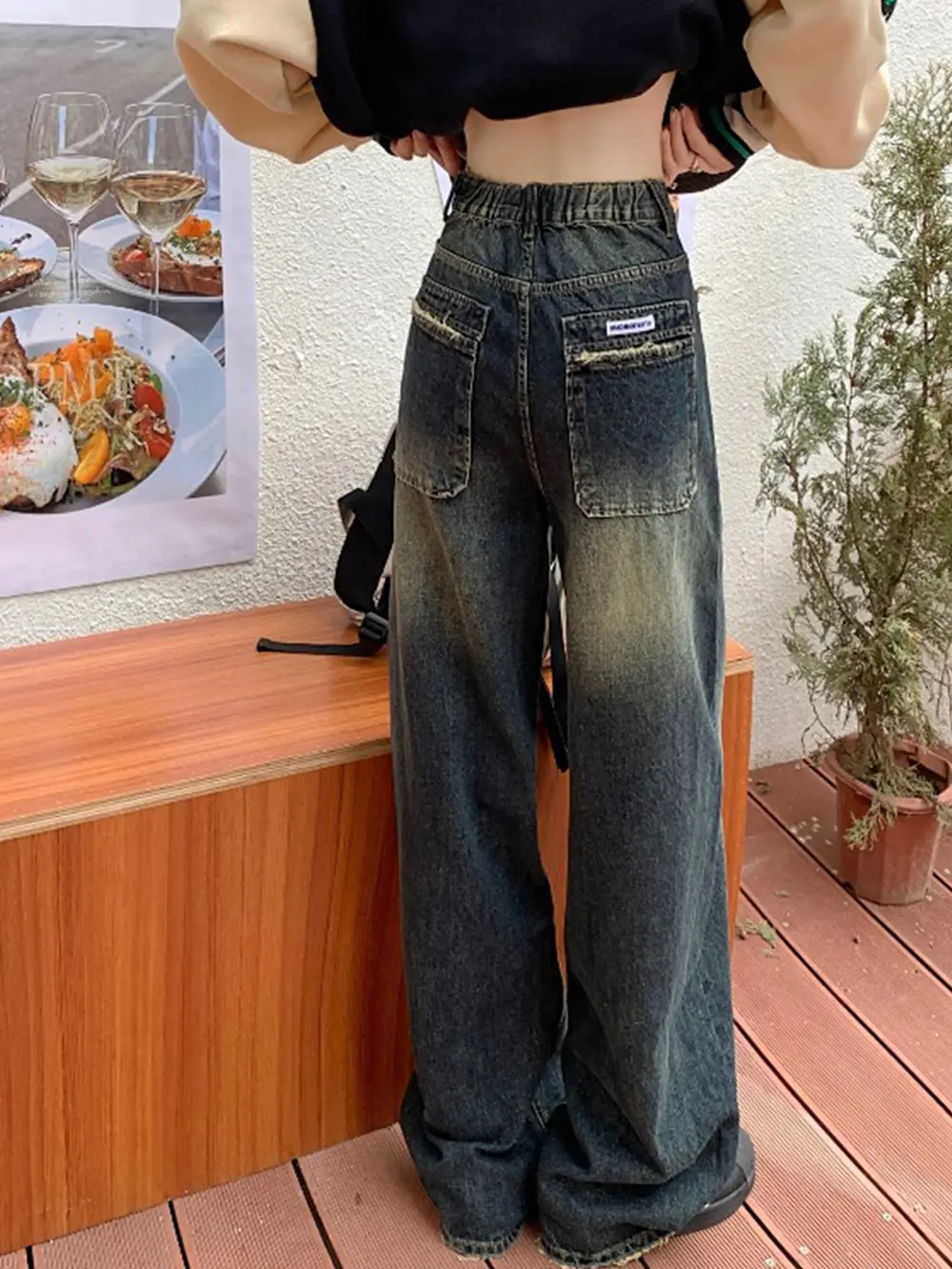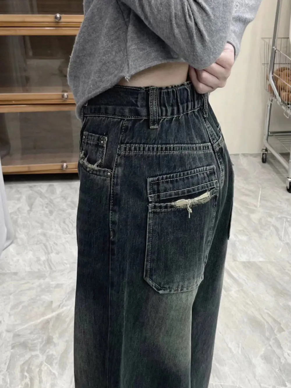 ABSOLUTELY AMAZING!!!! The waist band is flexible so I can wear it low rise whenever I want to, however, the dark blue color is actually more of a gray. here’s an example of what I mean! otherwise, super cute, baggy, and well made!