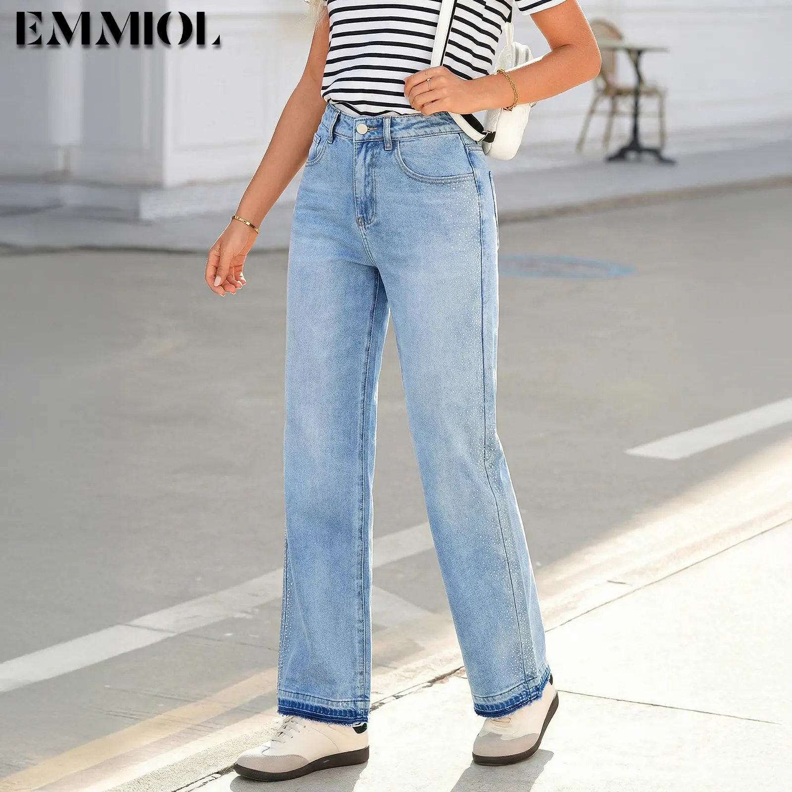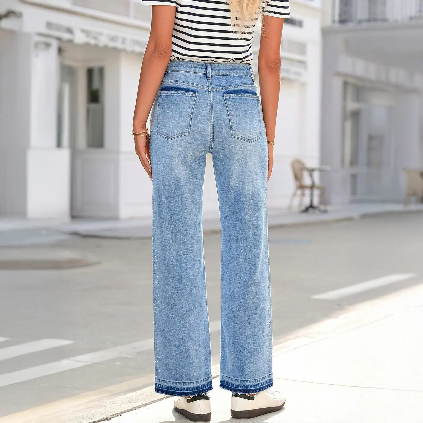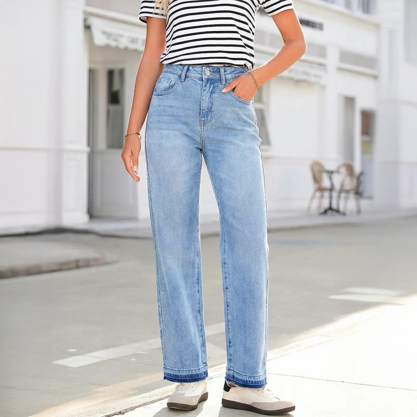 Design: Sparkly bling decor on pant sides adds unique charm, paired with raw hem at cuffs for casual vibe. Front and back pockets are functional, holding small items like phones or keys easily. It combines denim pants practicality with bling style
