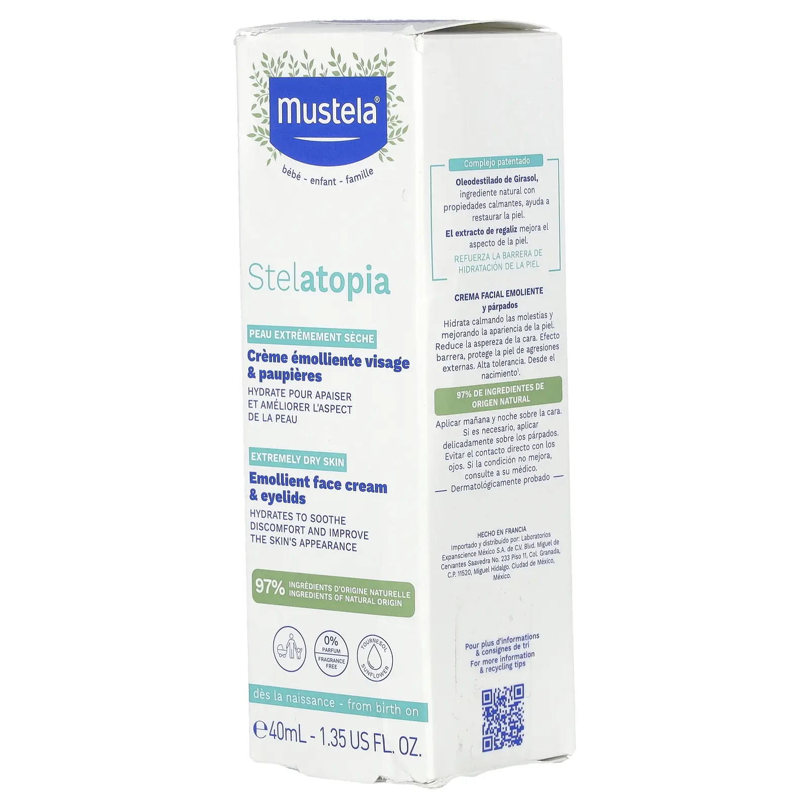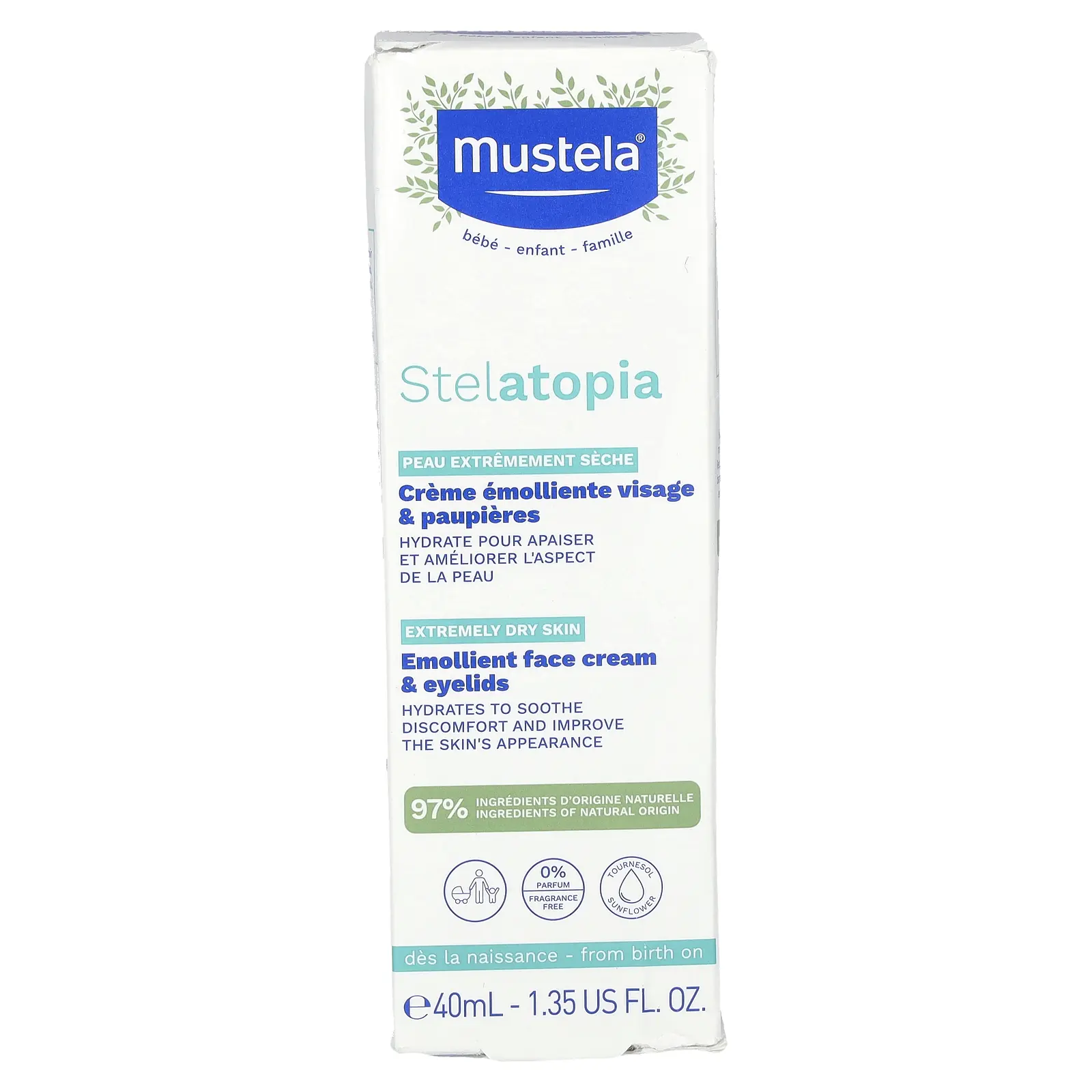Mustela Stelatopia Emollient Face Cream & Eyelids, Fragrance Free, 1.35 fl oz (40 ml)