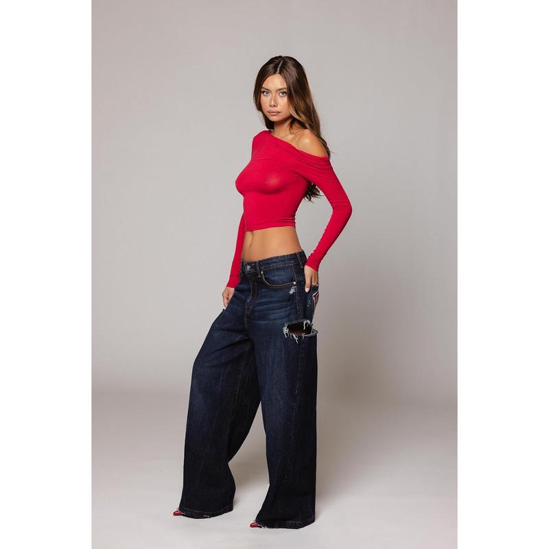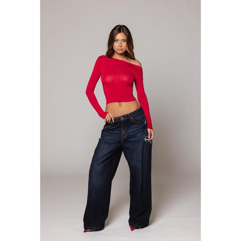 DESCRIPTION The Empire Jean is your go-to for a laid-back look. These vintage-inspired, wide-leg jeans feature an oversized fit and relaxed vibe, making them perfect for pairing with a graphic tee or crop top. With a dark-wash and effortless flow, The Empire Jean is ready for any occasion. Whether you're lounging or heading out, these jeans offer comfort with an edge. Paired with our Lana Long Sleeve in Cherry.