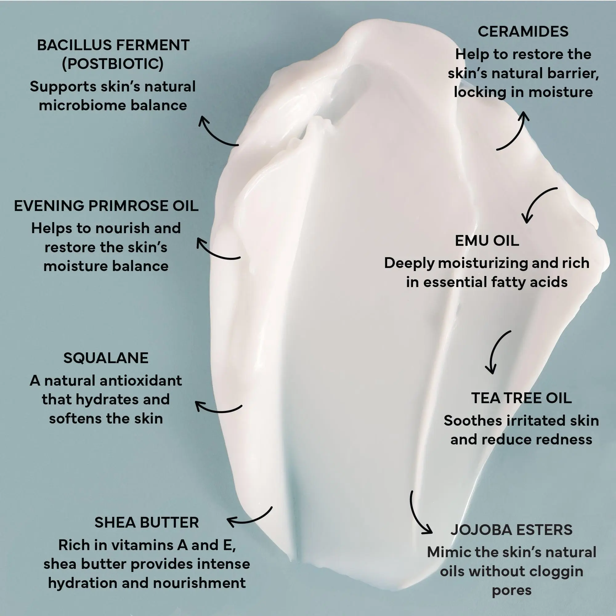 | Ingredients | Water/Eau/Aqua,Emu Oil,Caprylic/Capric Triglyceride,Dicaprylyl Ether,Glycerin,Polyglyceryl-6 Distearate,Behenyl Alcohol,Butyrospermum Parkii (Shea) Butter,Polyglyceryl-3 Stearate,Glyceryl Stearate Citrate,Isostearyl Isostearate,Jojoba Esters,Polyglyceryl-3 Beeswax,Cetyl Alcohol,Lysolecithin,Squalane,Allantoin,Phytosphingosine,Tocopheryl Acetate,Melaleuca Alternifolia (Tea Tree) Leaf Oil,Lactobacillus Ferment,Ceramide 3,Tetrahexydecyl Ascorbate,Olive Glycerides,Propanediol,Aloe Barbadensis Leaf Juice,Sclerotium Gum,Xanthan Gum,Sodium Hyaluronate,Hydrogenated Palm Kernel Glycerides,1,2-Hexanediol,Hydrogenated Palm Glycerides,Cedrus Atlantica Bark Oil,Pelargonium Graveolens Oil,Cananga Odorata Flower Oil,Citrus Grandis (Grapefruit) Peel Oil,Citrus Limon (Lemon) Peel Oil,Pogostemon Cablin Leaf Oil,Fusanus Spicatus Wood Oil,Hydroxyacetophenone,Caprylhydroxamic Acid,Sodium Hydroxide,Sodium Phytate,Pullulan,Silica. |