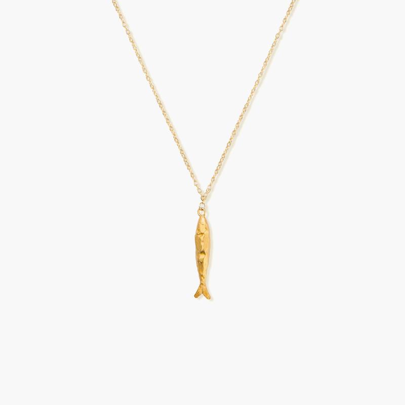 en route Gold Anchovy Necklace, Fish-inspired Pendant with Textured Finish, Stylish Statement Piece for Pairing and Set Styling