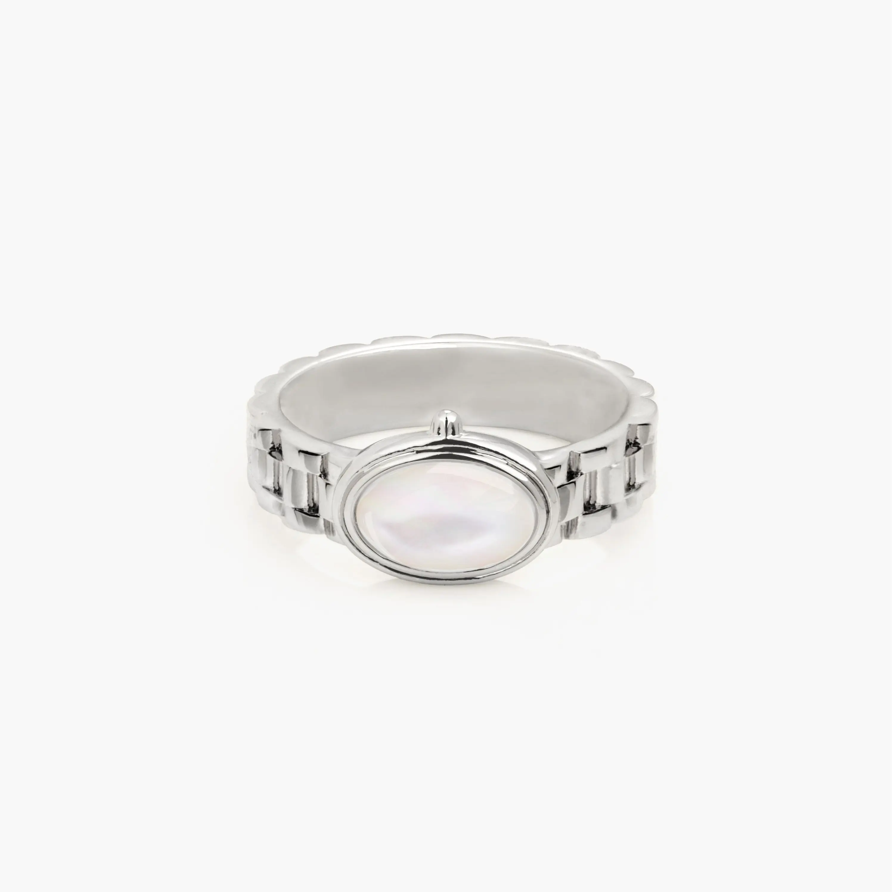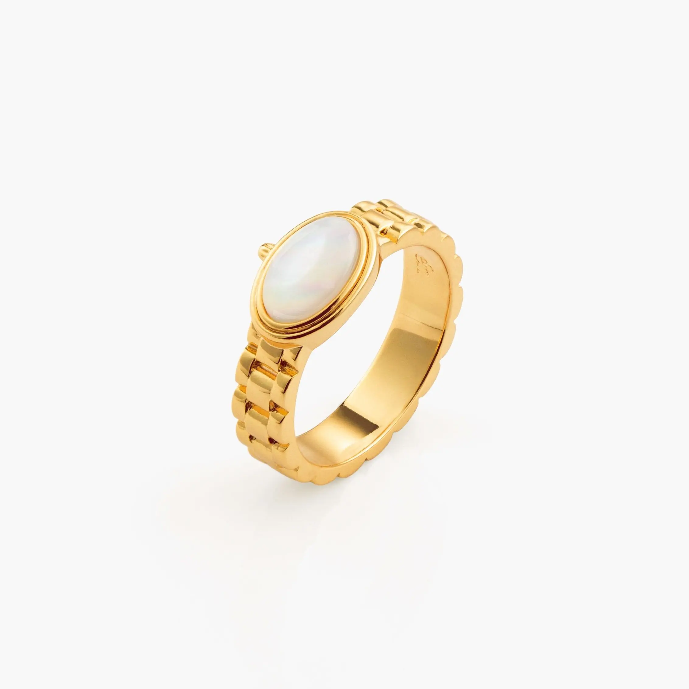 en route Watch Band Ring in Gold, Sleek Watch-Link Band Design Featuring Lustrous Mother of Pearl Inlay, Modern Statement Jewelry for Everyday Wear, Perfect for Layering or Solo Styling with Effortless Chic