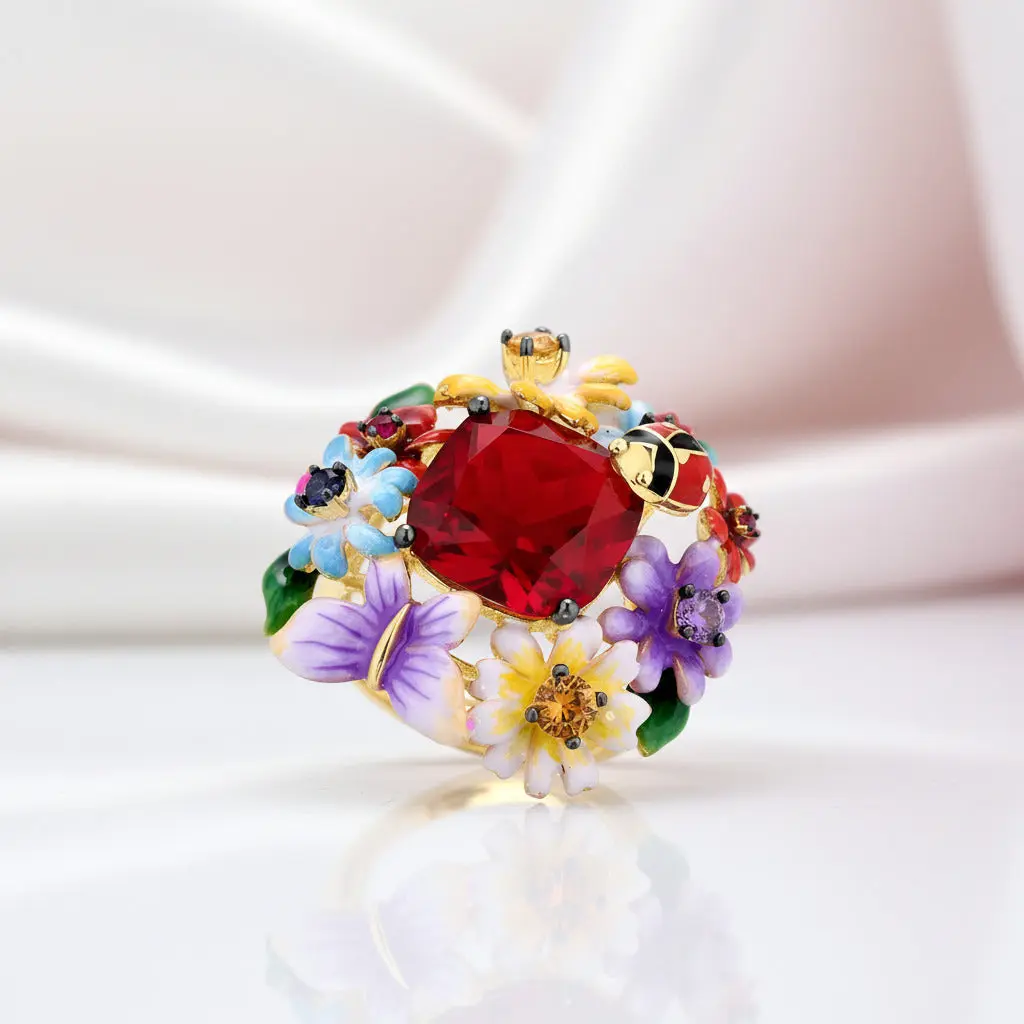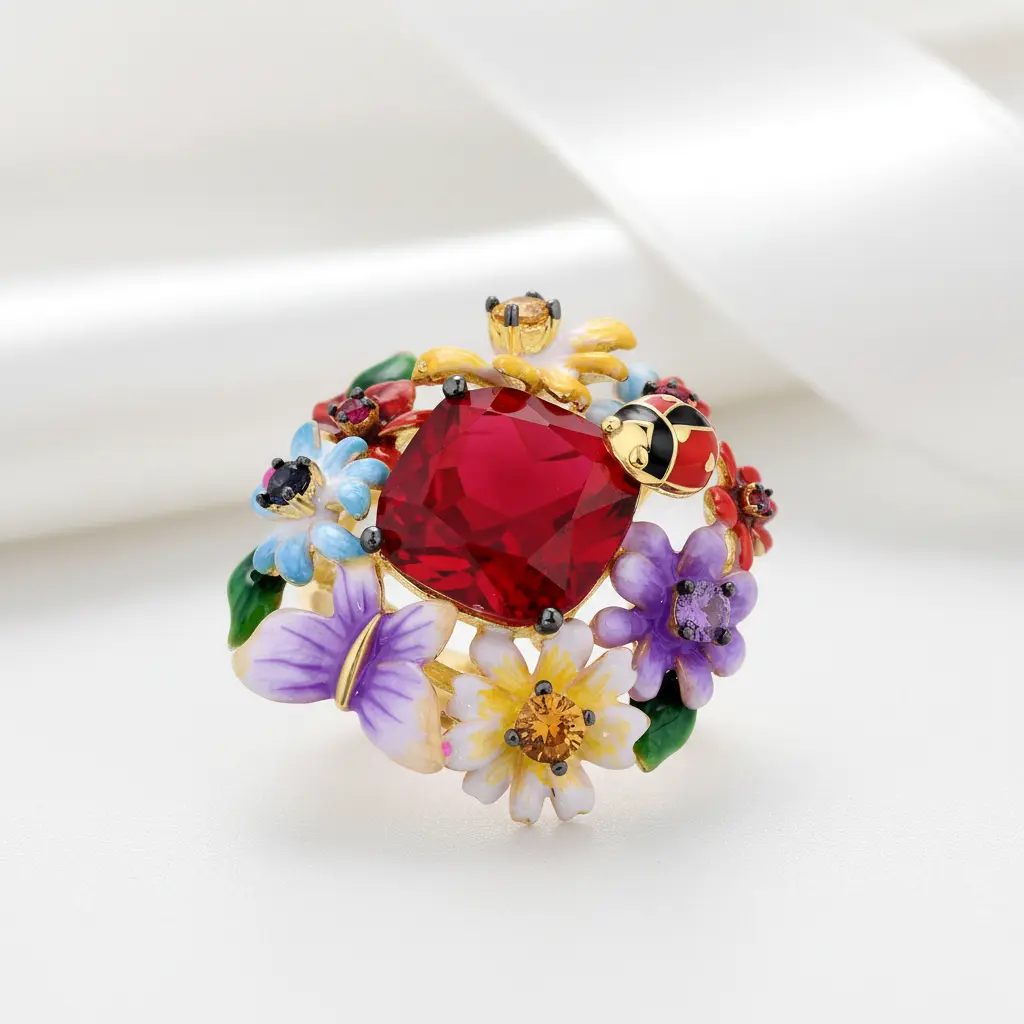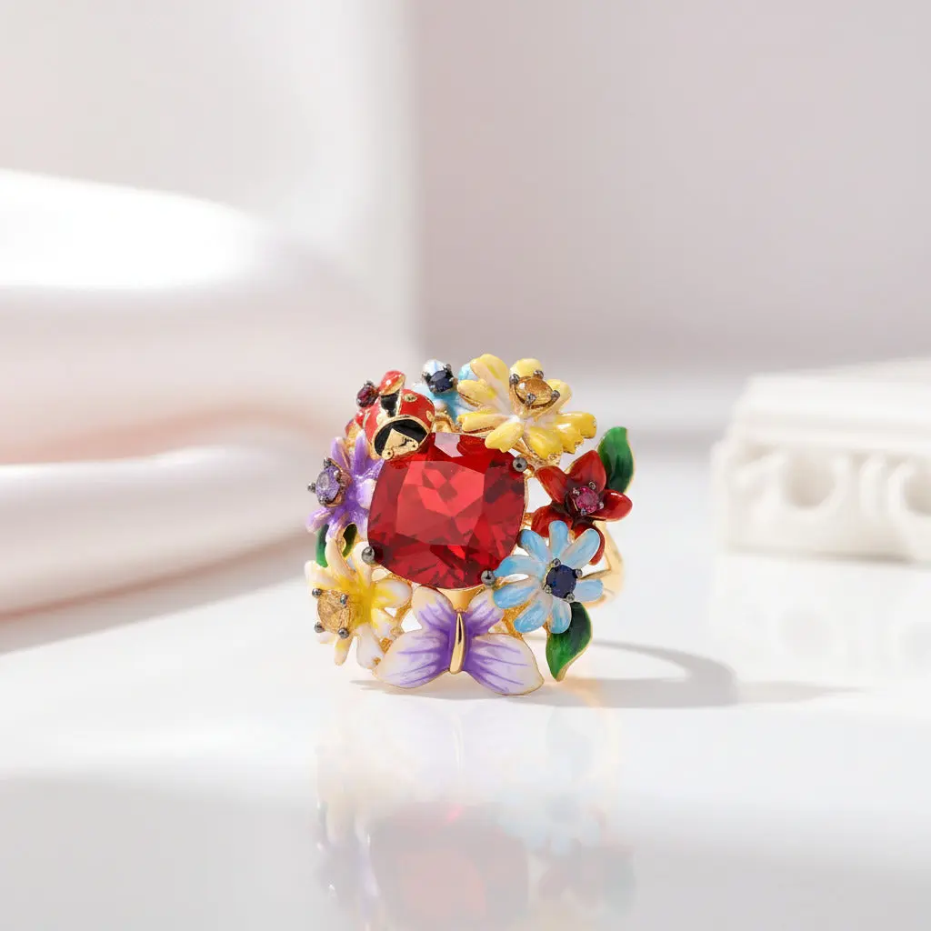 Enamel Flowers & Ladybug Ring Celebrate nature's charm with this handcrafted sterling silver ring, featuring vibrant enamel flowers and a delicate ladybug design. Each piece combines artisanal craftsmanship with premium materials, creating a statement accessory that reflects your individual style. Crafted from 925 sterling silver with a pave setting, this ring showcases diamond alternatives, ruby, and sapphire accents that catch the light beautifully. Weighing 9.75g, it's substantial yet comfortable for everyday wear. Perfect for those who value quality, sustainability, and unique design—a ring that stands apart from conventional jewelry.
