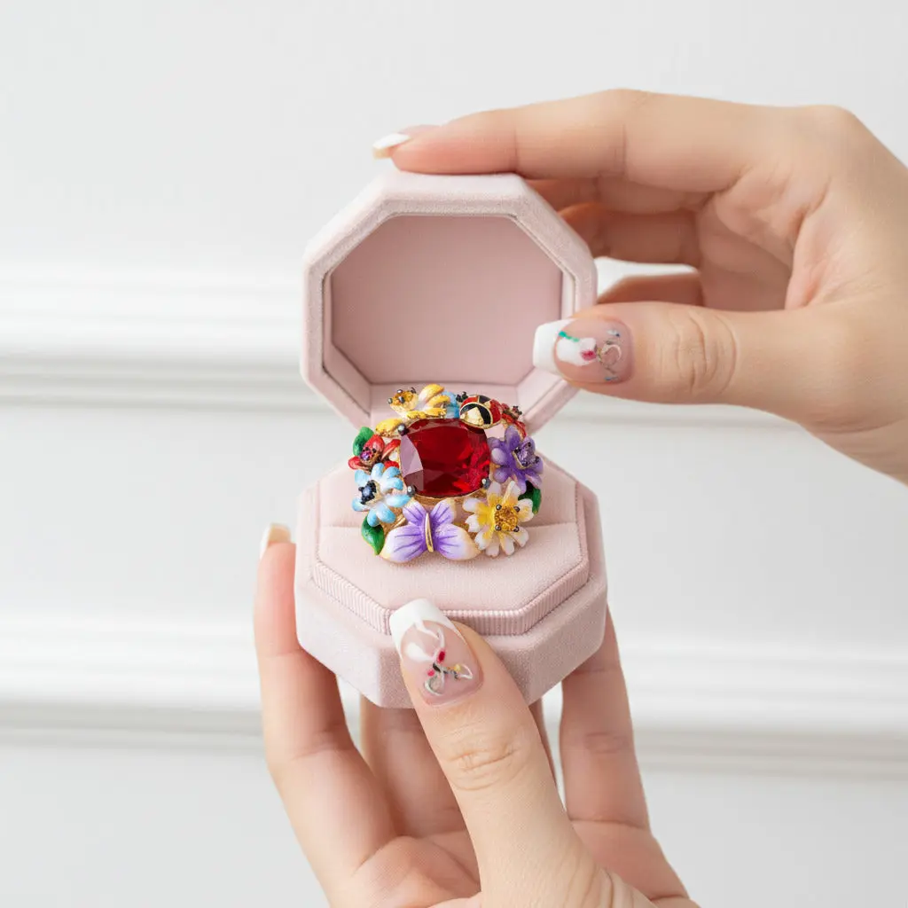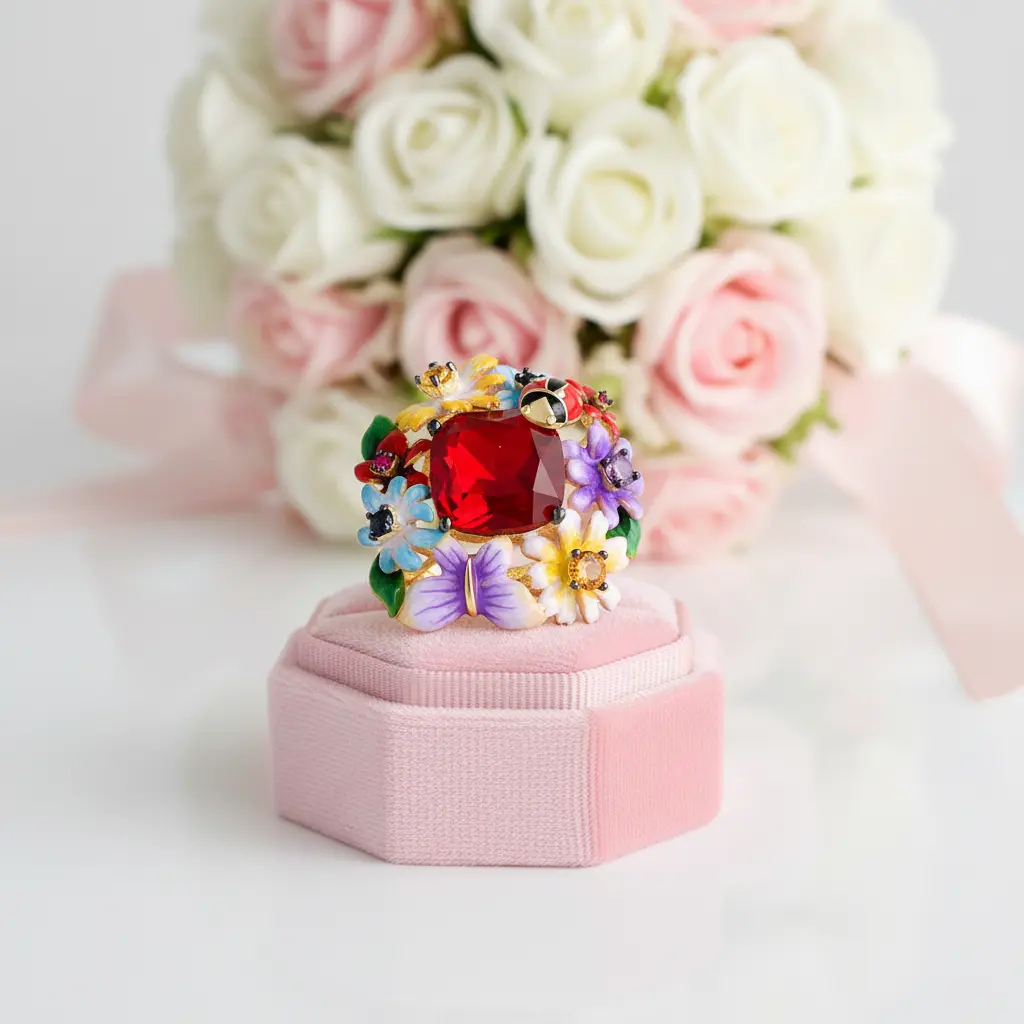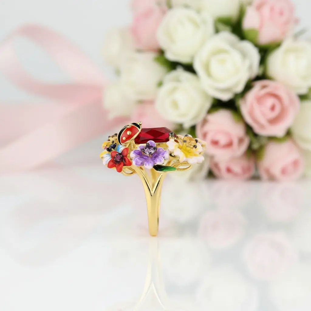 Enamel Flowers & Ladybug Ring Celebrate nature's charm with this handcrafted sterling silver ring, featuring vibrant enamel flowers and a delicate ladybug design. Each piece combines artisanal craftsmanship with premium materials, creating a statement accessory that reflects your individual style. Crafted from 925 sterling silver with a pave setting, this ring showcases diamond alternatives, ruby, and sapphire accents that catch the light beautifully. Weighing 9.75g, it's substantial yet comfortable for everyday wear. Perfect for those who value quality, sustainability, and unique design—a ring that stands apart from conventional jewelry.