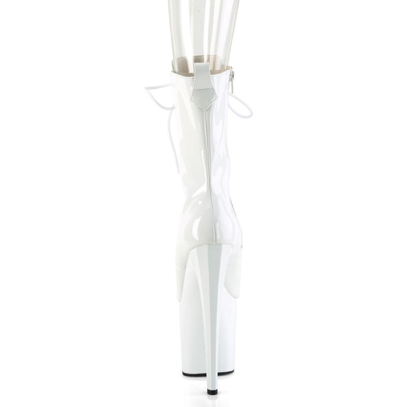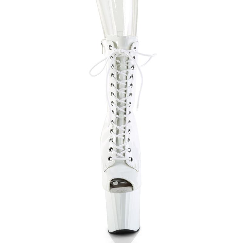 Elevate your wardrobe with the breathtaking Enchant-1041 ankle boots. Boasting a towering 8" heel and 3 3/4" platform, these white boots are a true showstopper. The lace-up front pairs beautifully with a sultry peep toe, while the prismatic linear design on the platform and heel adds a splash of iridescent charm. The inner side zip closure makes these boots both stylish and convenient. Perfect for making bold fashion statements, the Enchant-1041 is the ultimate choice.