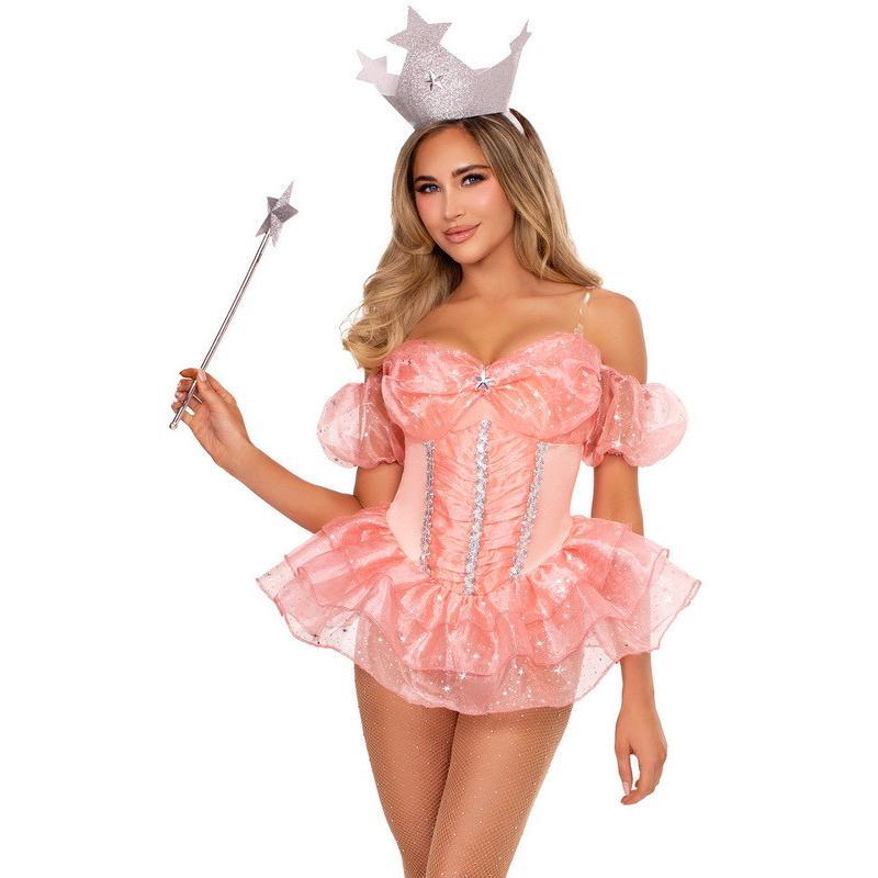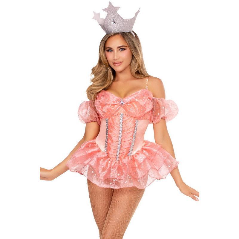 Be the best witch in town with this beautiful good witch costume! This set includes bodysuit with tiered organza skirt and star accents throughout for that touch of beauty, clear straps for comfort and flexibility, complete with matching crown headband to complete the look! Accessories not included.