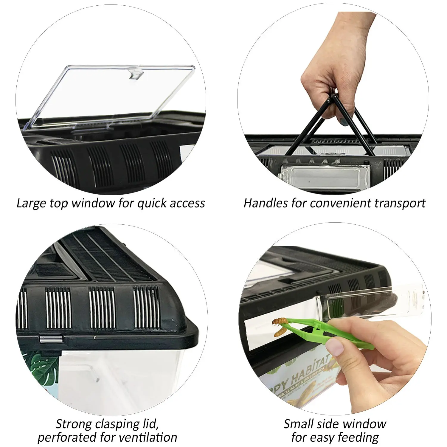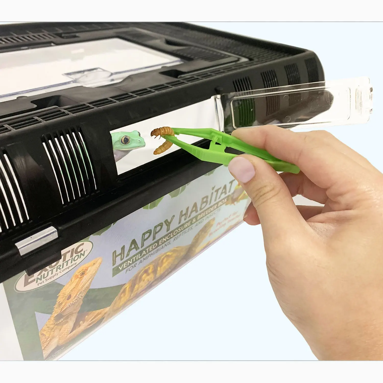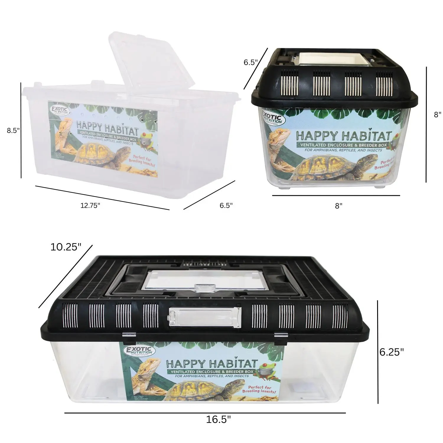 Exotic Nutrition's Happy Habitat is a ventilated enclosure & breeder box for live feeder insects, reptiles, and amphibians. This enclosure is a durable storage and breeding container ideal for housing live mealworms. Each plastic container is stackable, easy to clean, and can be used wet or dry. It also has a double-sided lid, and airline tubing holes.