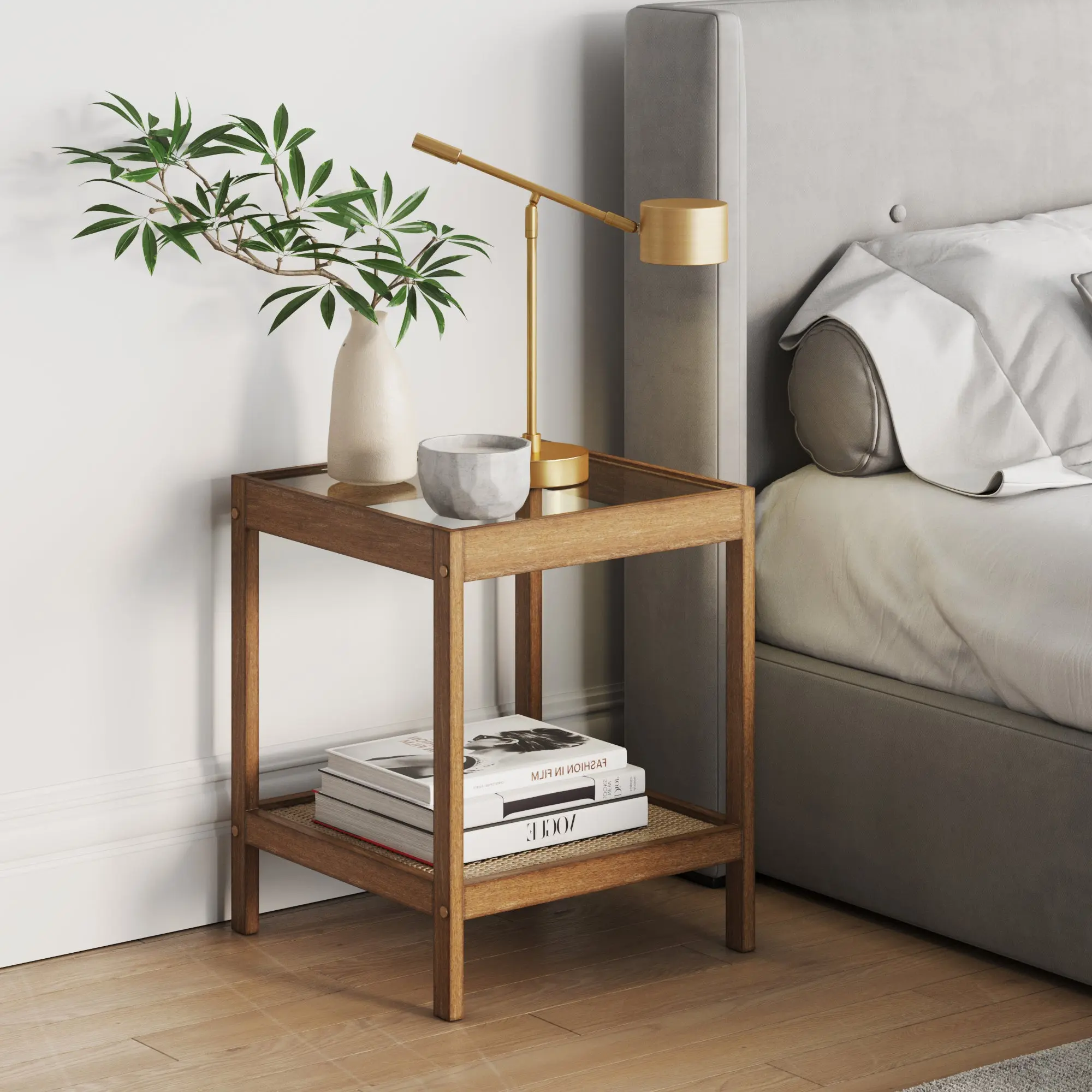 Introducing Hayes – a stylish and durable piece with a tempered safety glass top, natural woven cane, and a solid wood frame with wood veneer. Each piece is unique, showcasing natural wood variations in color and texture, making Hayes a one-of-a-kind addition to your home.