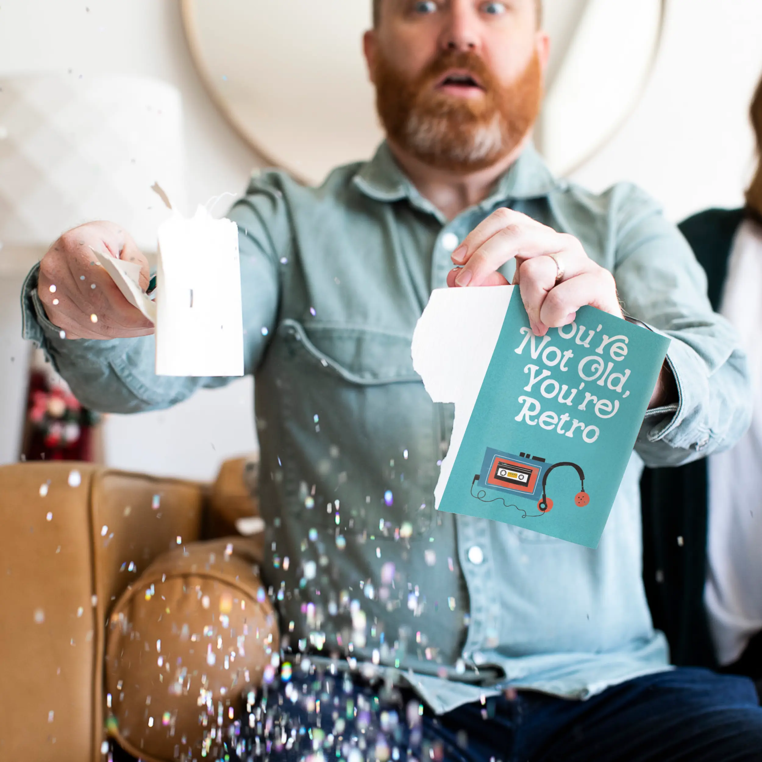 So funny, loved giving this to my husband! Unfortunately, when he ripped it open to try to get the battery to stop he ripped it so carefully that the confetti is not make a mess LOL! Still it was such a fun gift, even so :)