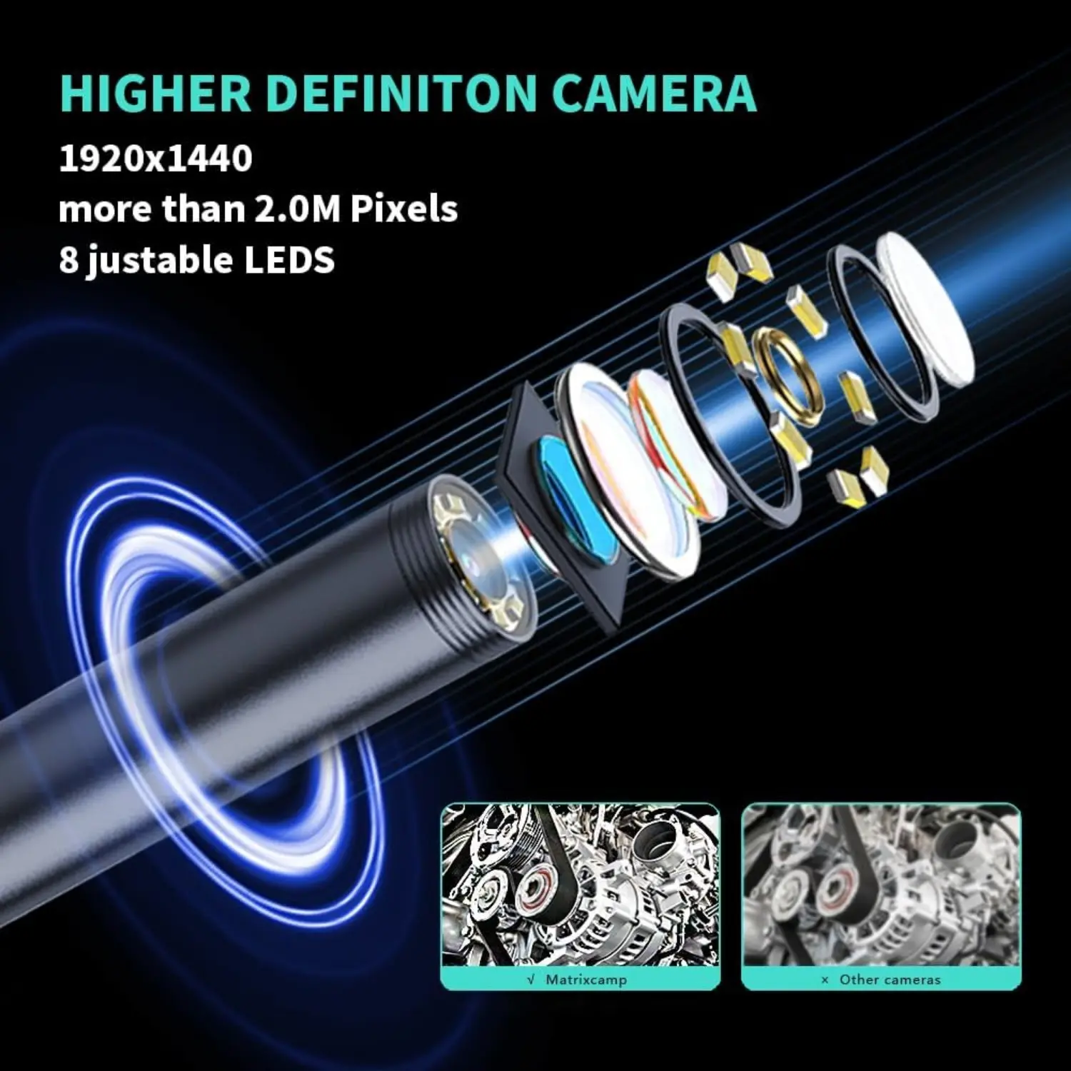 The Endoscope Camera W400 5M is compatible with iOS and Android devices. It features HD 1920x1440 resolution and IP67 waterproof rating. The flexible cable is 16.4ft (5M) semi-rigid, with 8 adjustable LED lights. Perfect for dark, damp, or wet environments. The probe diameter is 7.9mm.