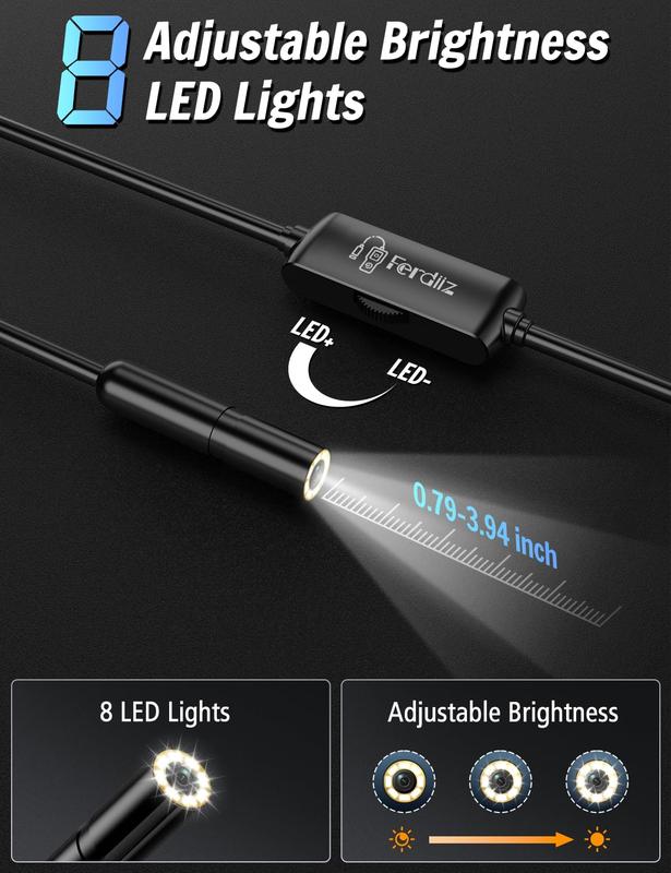 ·1920P HD Dual Lens Inspection Camera: The Ferdiiz endoscope 7.9mm probe sewer camera makes it easy to inspect hard-to-reach areas, with a 2.0MP HD dual lens borescope for more precise image focus, 1920P resolution for close-up image capture and high-definition video that's perfect for use with cell phones, so you can easily maneuver through even the tightest of spaces. Note: The dual lenses are not used simultaneously, long press to switch the Side lens.