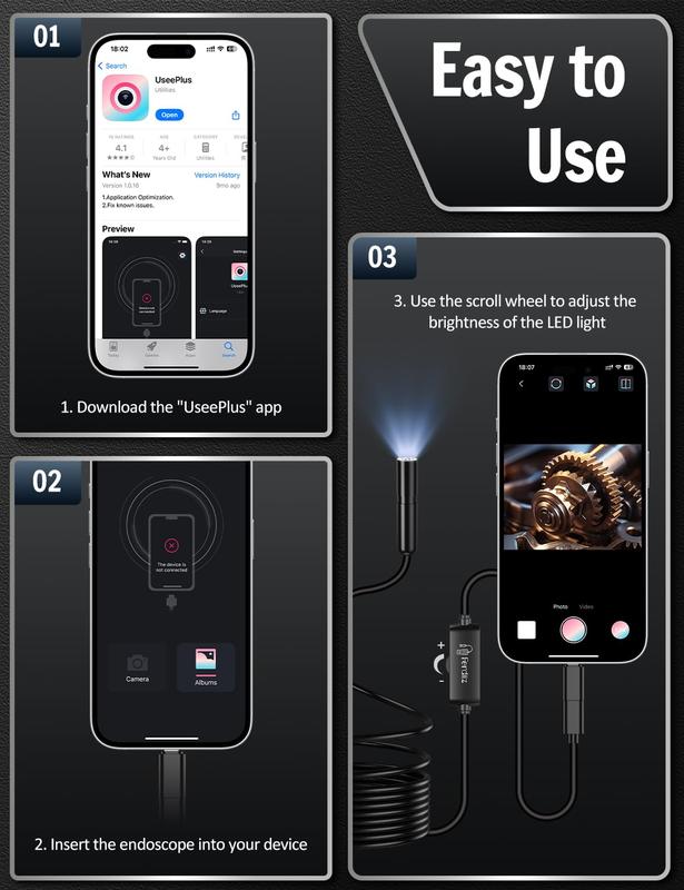 · Wide Compatibility: The borescope inspection camera comes with Lightning, Type-C adapters for phones with Android 6+ and iOS 9+ and above. Whether you are an iPhone user or Android user, you can use it easily. Note: Only for Android smartphones/tablets with OTG and USB UVC function . Install the free app"UseePlus", plug and play. Don't fit computer.