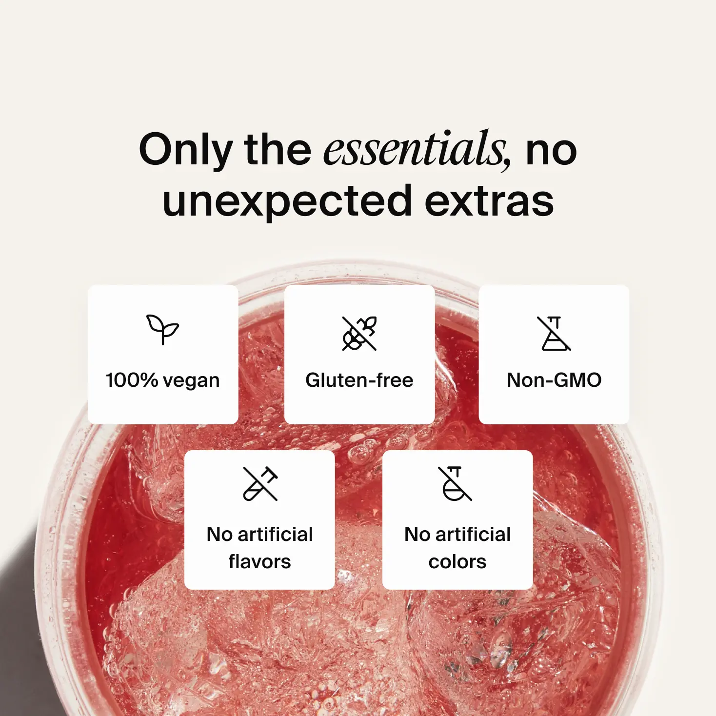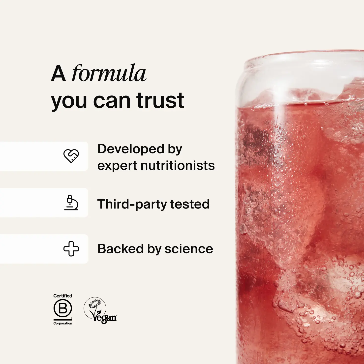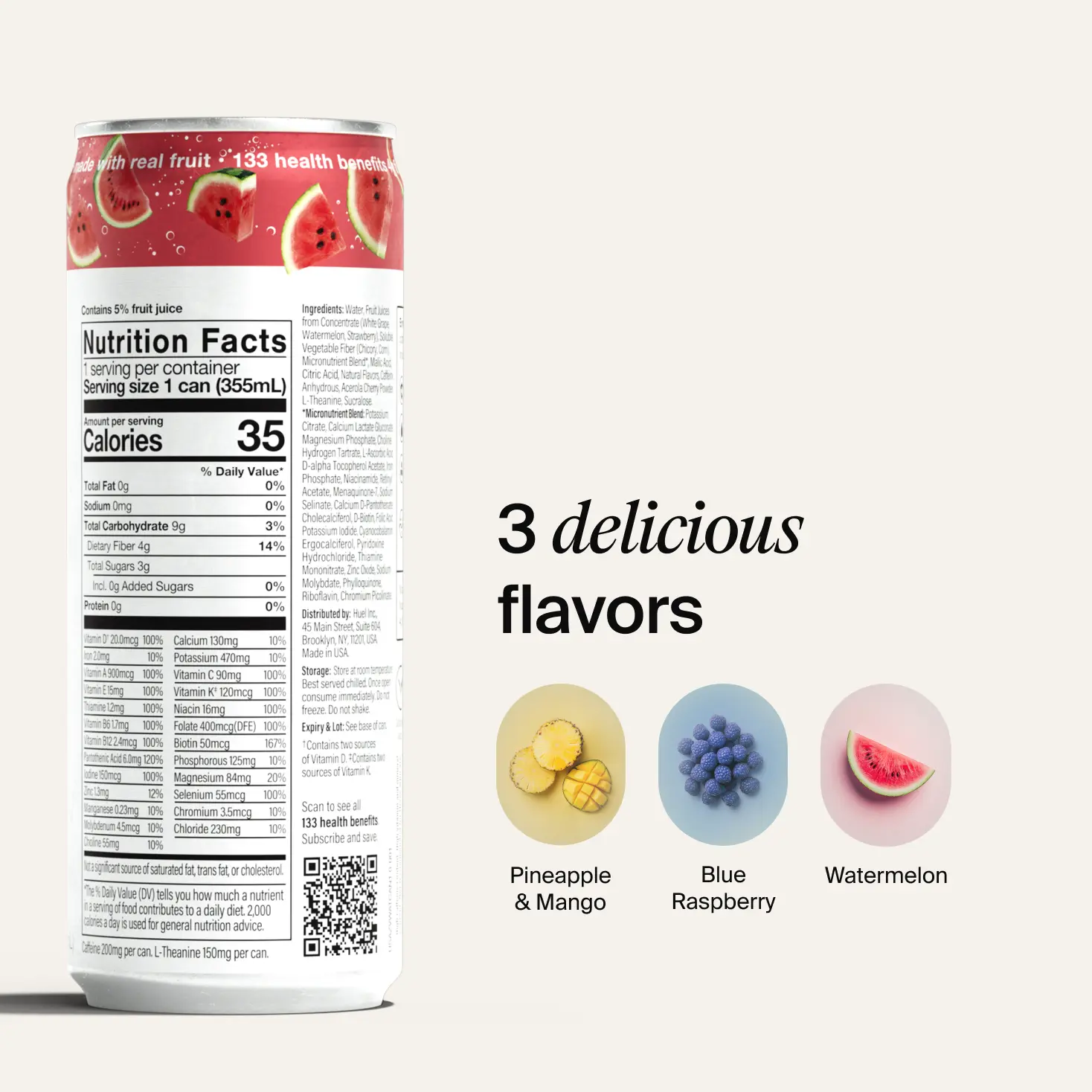 | Ingredients | Water,Fruit Juices from Concentrate (White Grape,Pineapple,Mango),Soluble Vegetable Fiber (Chicory,Corn),Micronutrient Blend,Malic Acid,Citric Acid,Natural Flavors,Caffeine Anhydrous,Acerola Cherry Powder,L-Theanine,Sucralose,Potassium Citrate,Calcium Lactate Gluconate,Magnesium Phosphate,Choline Hydrogen Tartrate,L-Ascorbic Acid,D-alpha Tocopherol Acetate,Ferric Pyrophosphate,Niacinamide,Retinyl Acetate,Sodium Selenite,Menaquinone-7,Calcium D-Pantothenate,Ergocalciferol,Cholecalciferol,D-Biotin,Folic Acid,Cyanocobalamin,Pyridoxine Hydrochloride,Phylloquinone,Thiamine Mononitrate,Potassium Iodide,Zinc Oxide,Sodium Molybdate,Manganese Sulphate,Chromium Picolinate |