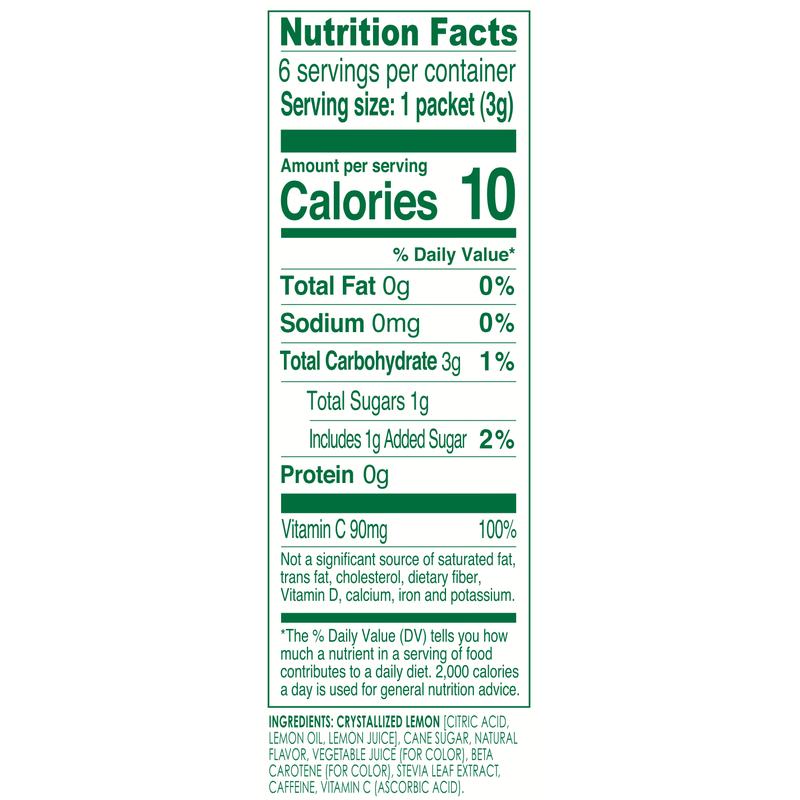 Ingredient FeatureSugar Free,Gluten Free,Saturated Fat Free,Cholesterol Free,Low Sodium,Low Fat,Low Sugar,Healthier Choice,Gmo Free,Vegetarian,Lactose Free,Caffeine from Green Tea,100% DRV Vitamin C,Sweetened with Stevia,Zero Calories,Fruity, Full Body Flavor,NO Artificial Sweeteners,0g Sugar,Non-GMO