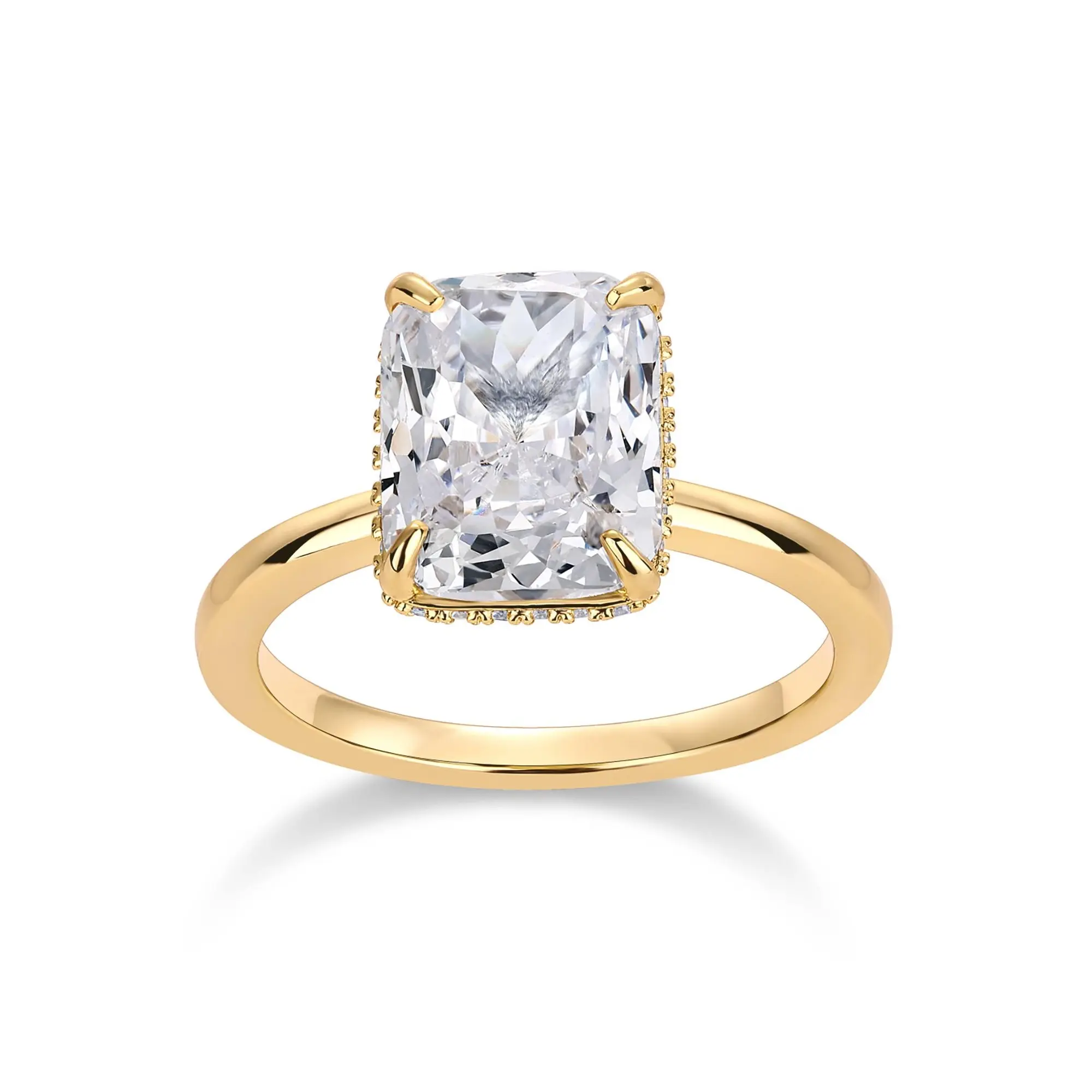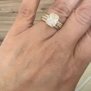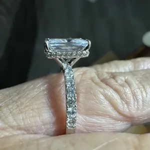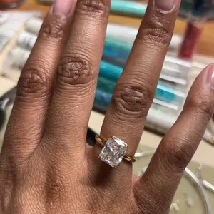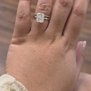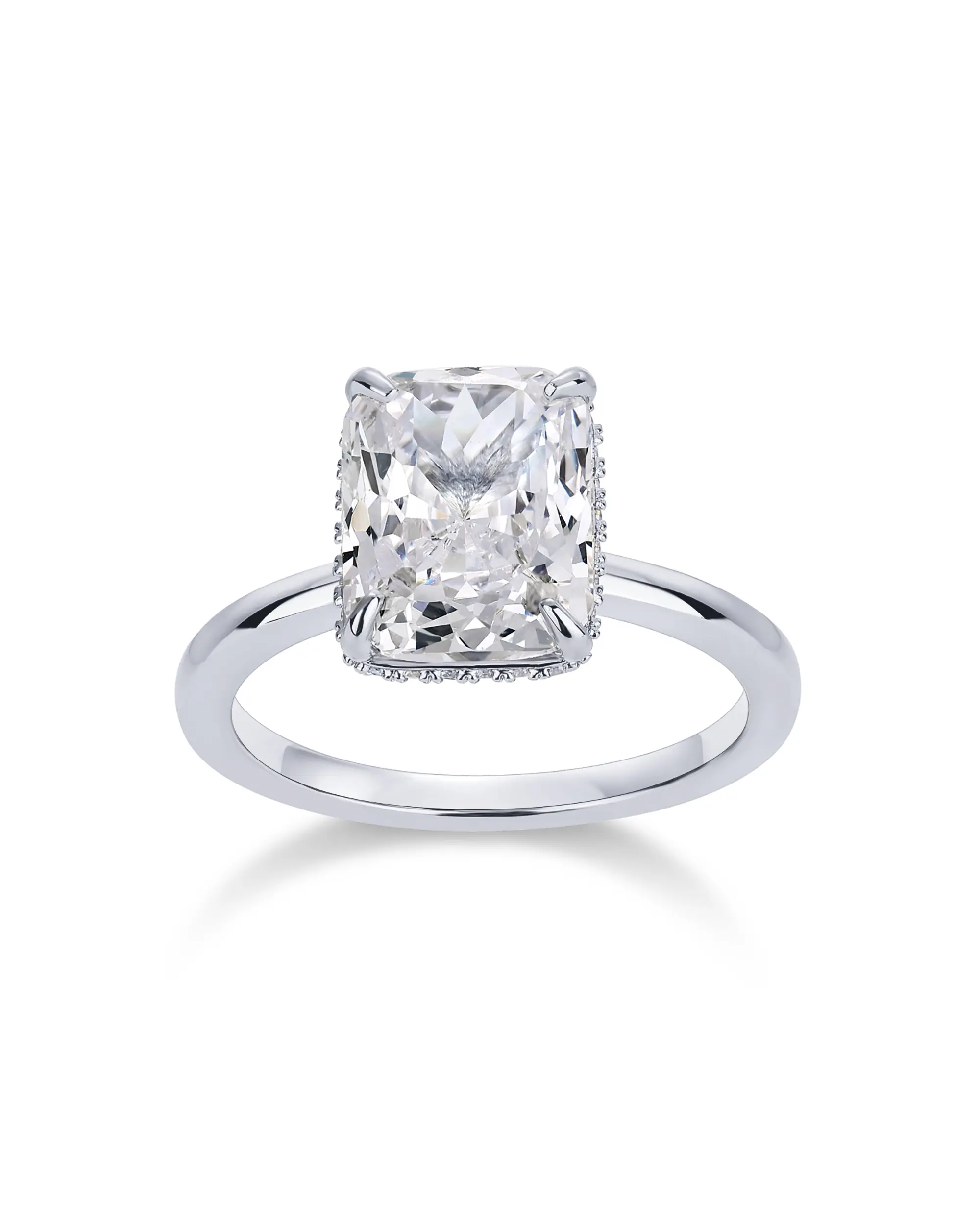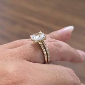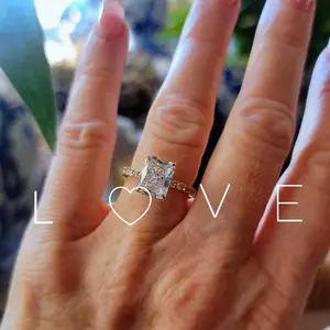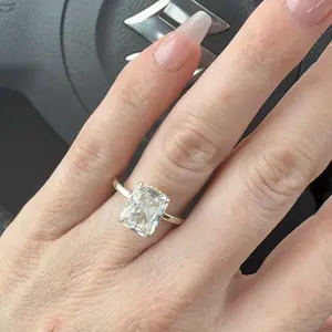 Plain Band Ring: The plain band ring is a sleek 2mm wide, perfectly complementing the 8mm x 10mm radiant-cut cubic zirconia. The hidden halo creates a seamless, sophisticated look, elevating the ring's elegance.