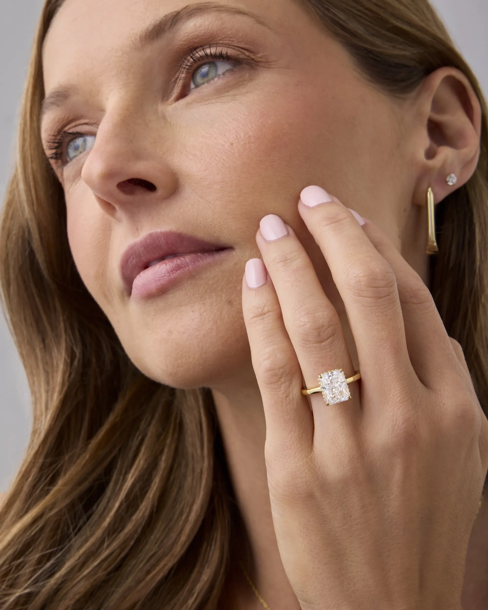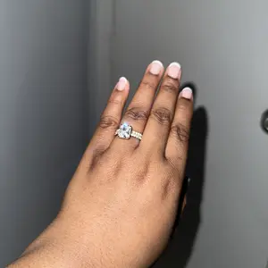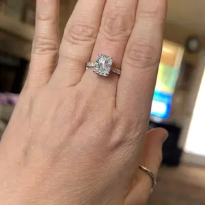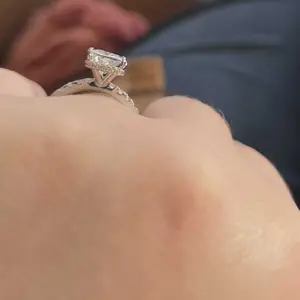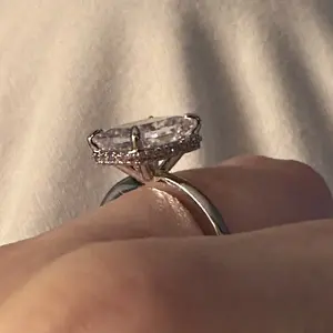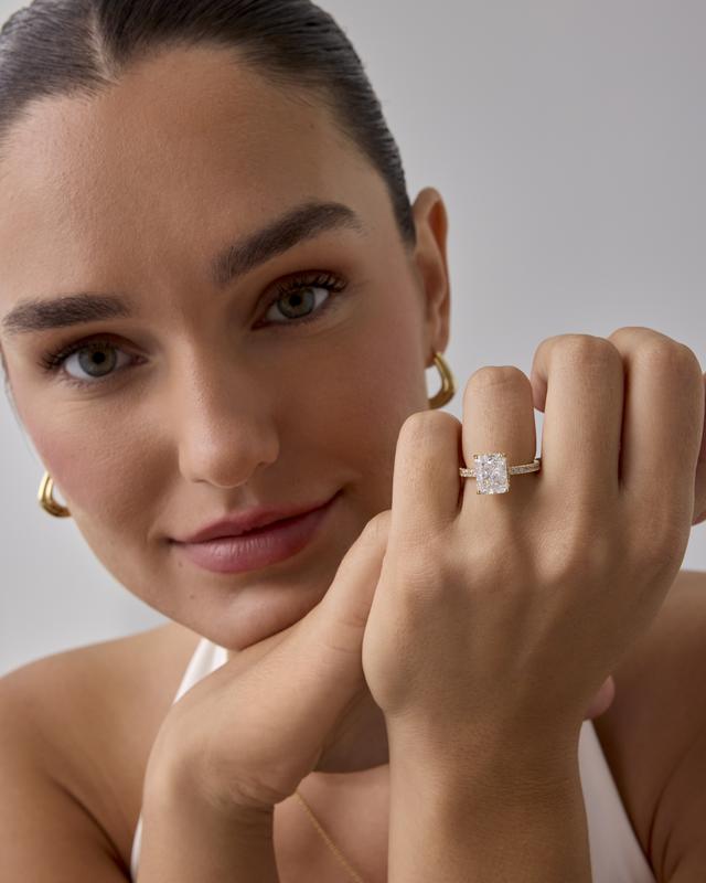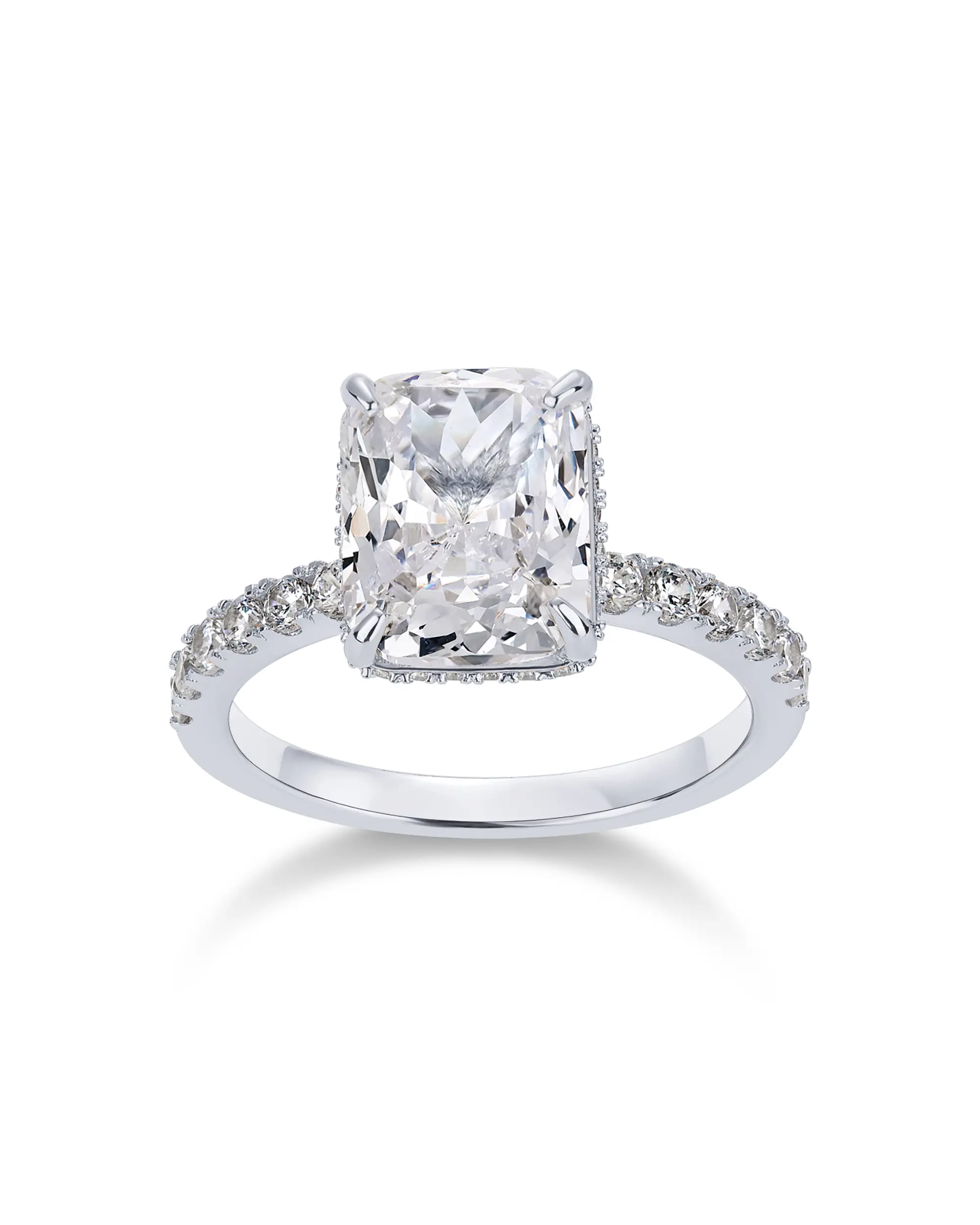 Plain Band Ring: The plain band ring is a sleek 2mm wide, perfectly complementing the 8mm x 10mm radiant-cut cubic zirconia. The hidden halo creates a seamless, sophisticated look, elevating the ring's elegance.