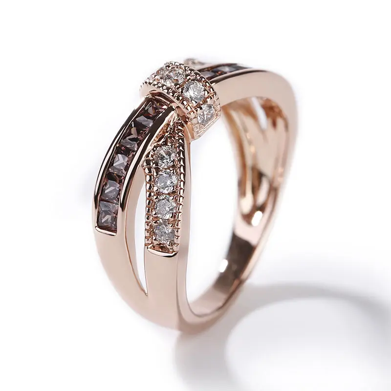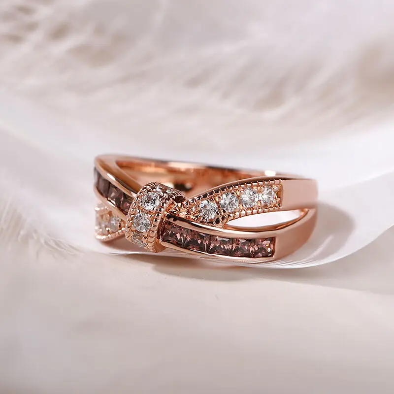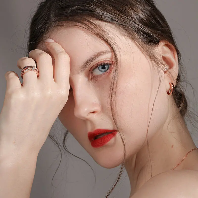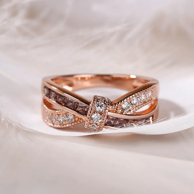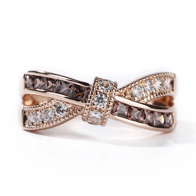 【INSPIRATION】: Dainty and delicate, this ring suits her feminine style. Created in sterling silver, this ring showcases a bow tie at the center. Polished and stone-lined ribbons flank the center, creating the ring's charming split shank. As lovely as she is, this ring is a look she'll treasure. a round cut stone, and the prongs are decorated by rose gold tone and glittering stones. Give her the classic look of confidence with these sparkling stud earrings.