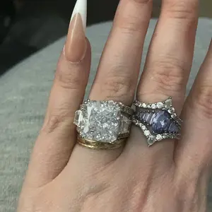 The 4-prong setting for the center stone ensures it is securely held while allowing light to enter from all angles, maximizing its brilliance. Surrounding the center stone are trapezoidal-cut white stone side stones, totaling 1.0 carat, adding to the overall grandeur and complementing the center stone beautifully.
