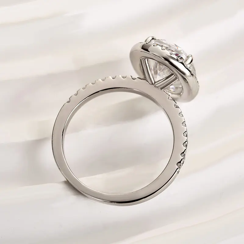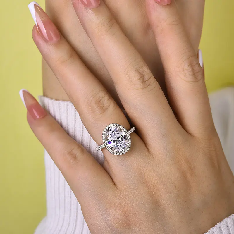 The Maxine Elegant 3.5ct Oval Cut Engagement Ring showcases a breathtaking 3.5-carat oval-cut center stone, surrounded by a shimmering halo of smaller stones. Set in elegant white gold, this ring offers a timeless and sophisticated design, perfect for celebrating love and commitment with exceptional brilliance.