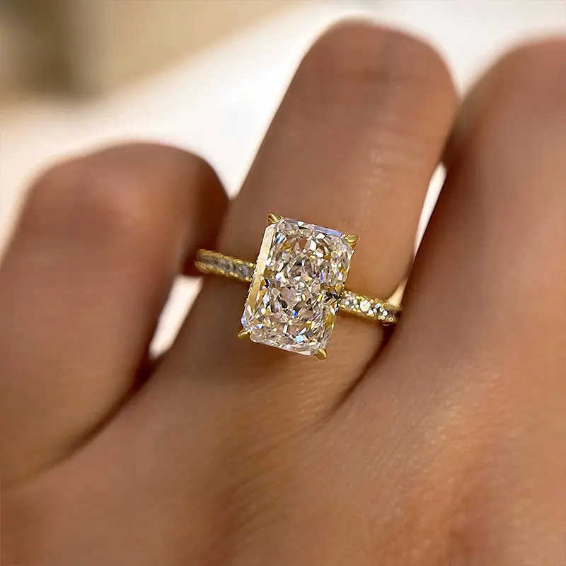 Symbolizing the everlasting bond of love, this exquisite piece showcases a radiant-cut stone that dazzles with its brilliance and fire. The unique facets of the radiant cut create a stunning play of light, capturing the essence of your love story. Crafted with meticulous attention to detail, this ring embodies the perfect blend of sophistication and grace. Its sleek silver band adds a touch of modernity, while the radiant-cut stone takes center stage, radiating a captivating sparkle that will leave a lasting impression.With its classic design and enduring beauty, this radiant-cut engagement ring is a testament to your eternal love. Let it be a symbol of the promises you make to each other, a reminder of the journey you embark upon together.