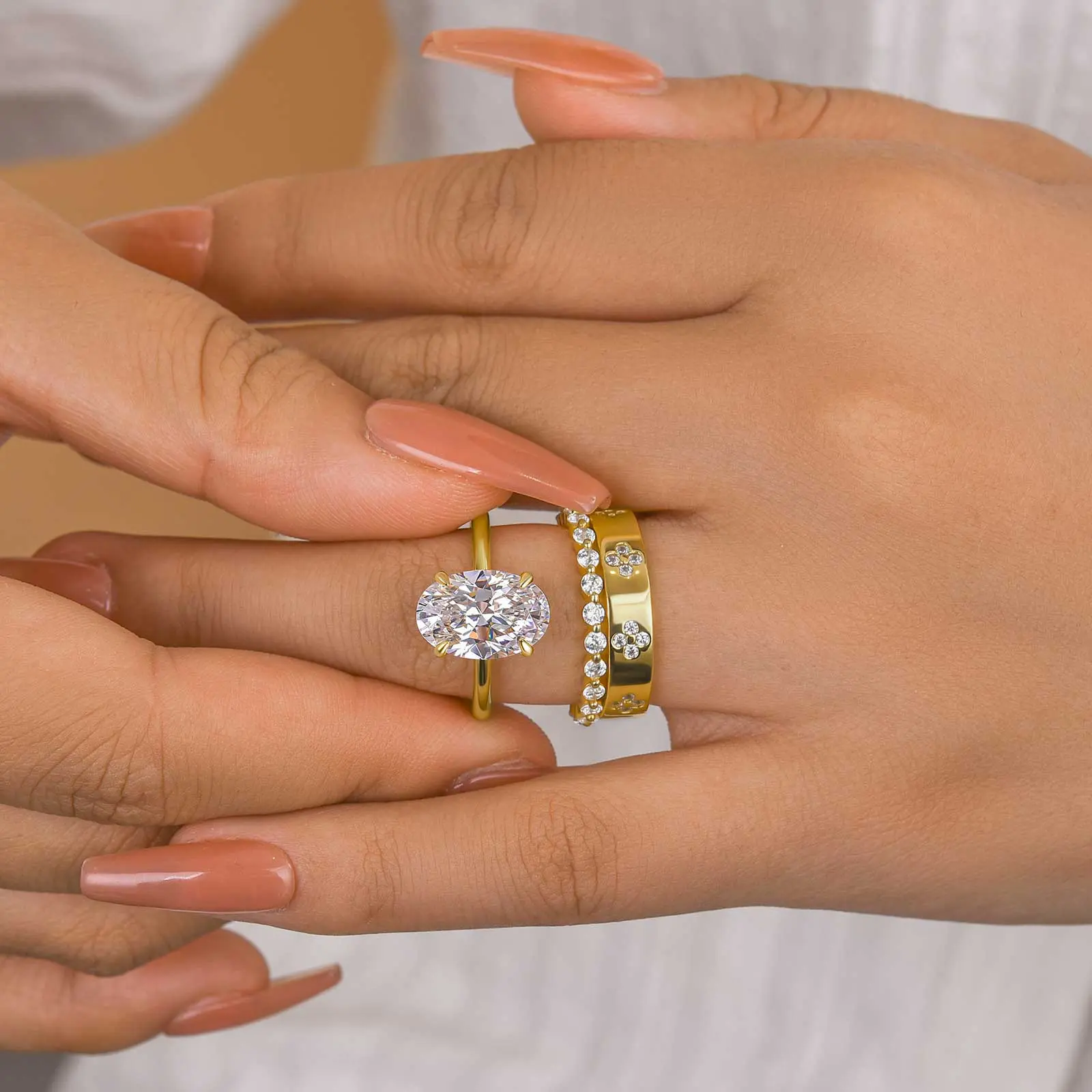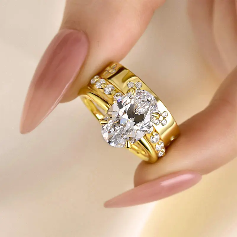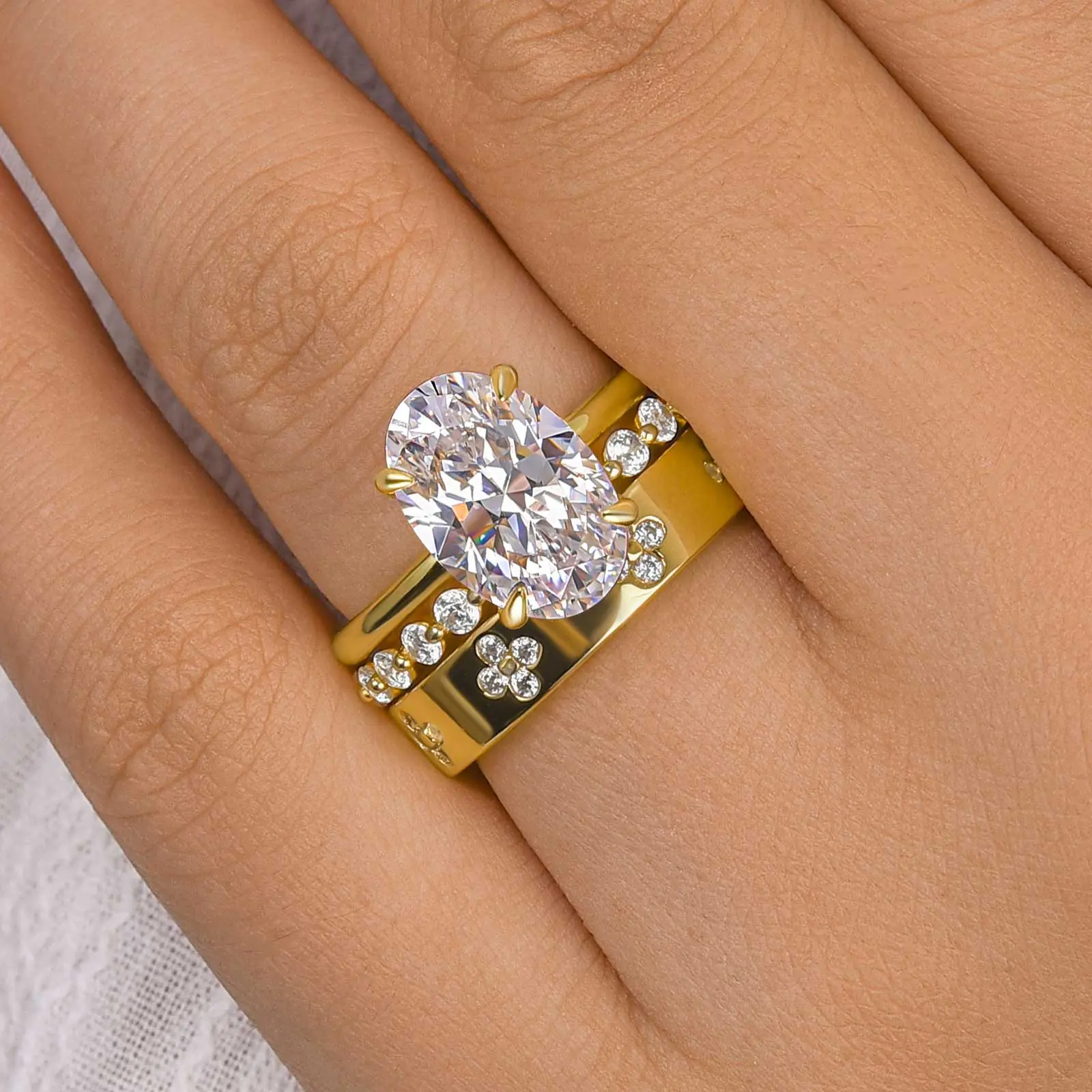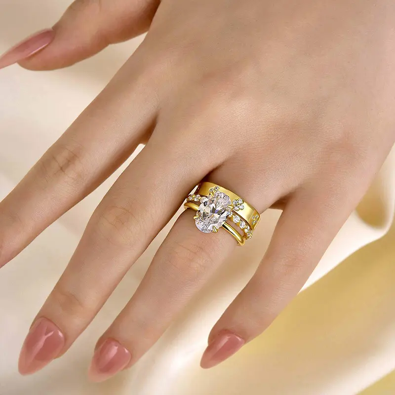 Designed with romance in mind, the ring set is a testament to a love that is as enduring and brilliant as the shimmering stones it showcases. It is a promise of forever, a celebration of a bond that shines brighter with each passing day. The harmonious blend of the oval and round cuts signifies the perfect balance and unity in a relationship, where each partner complements and completes the other.