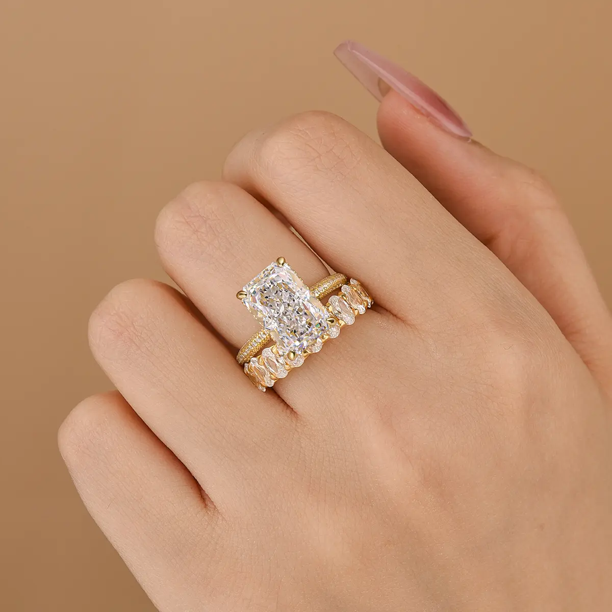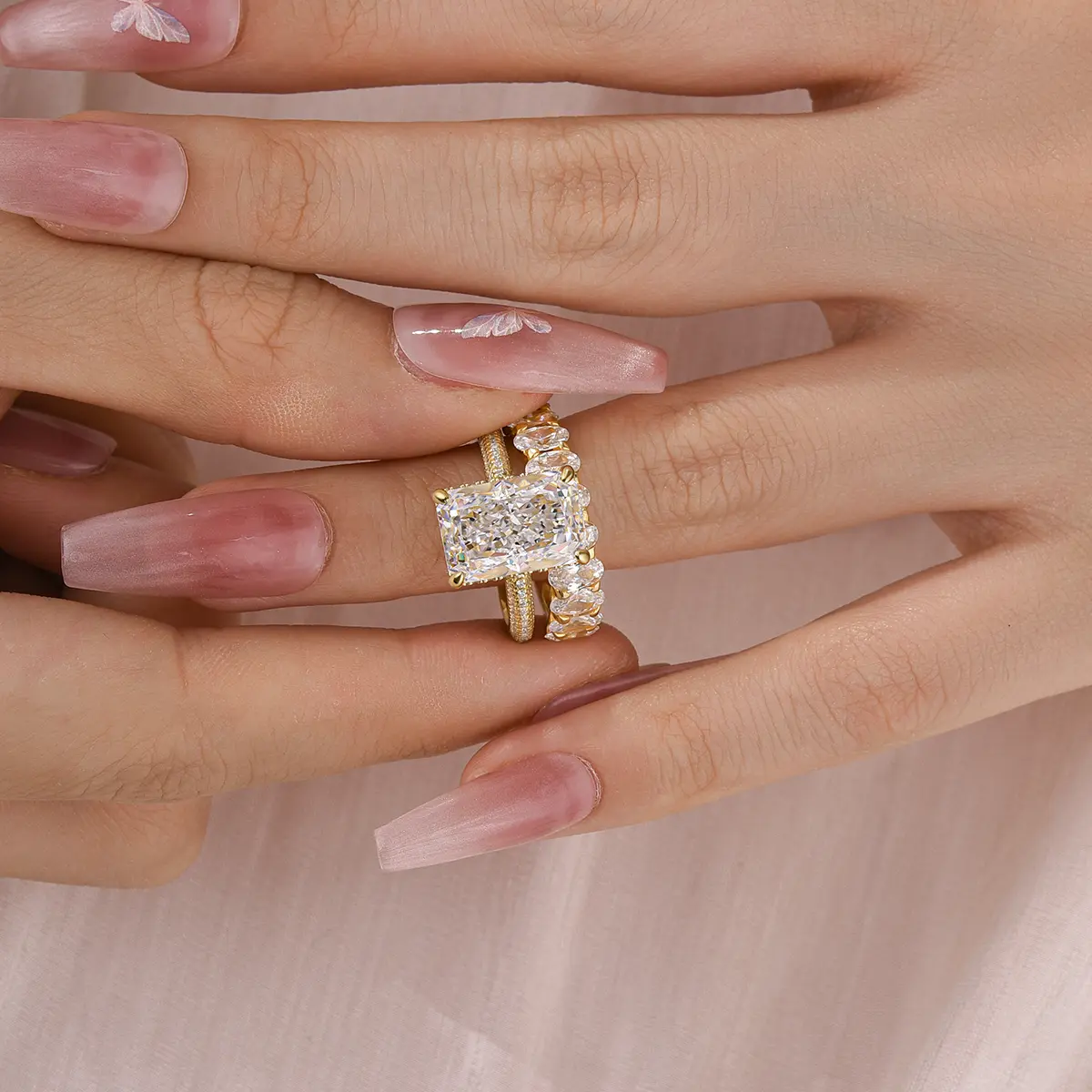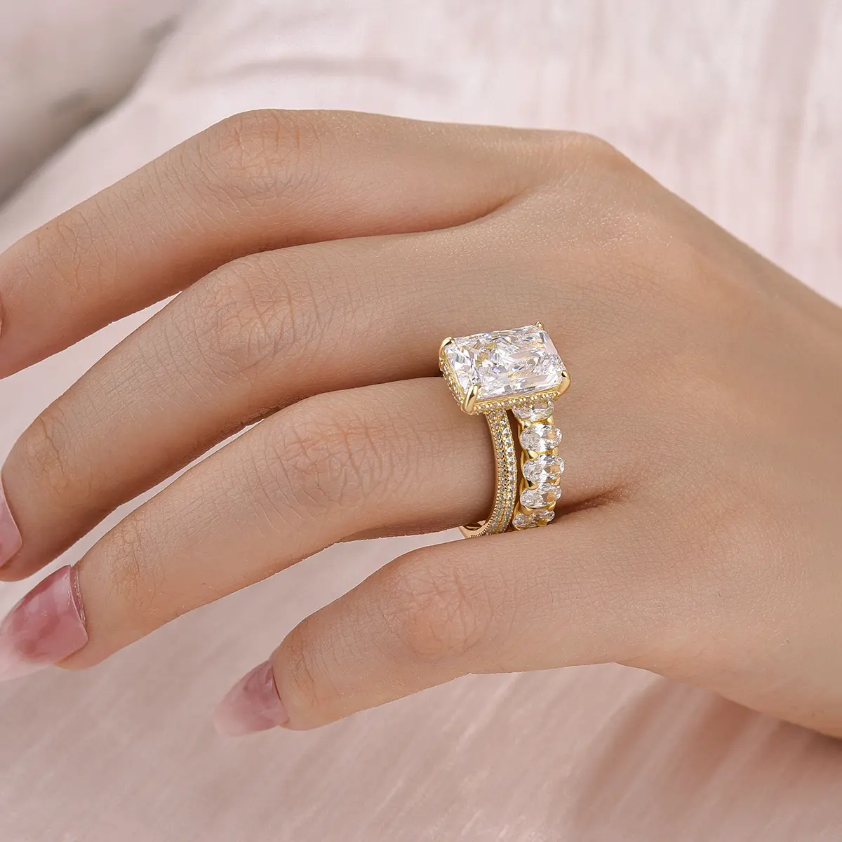 This exquisite set features a breathtaking 6.0-carat radiant-cut center stone, beautifully complemented by a matching band. Crafted with meticulous attention to detail, the rings showcase a brilliant shine and timeless design, making them the perfect choice for celebrating your love. Elevate your proposal with the Maxine set, where luxury meets romance.
