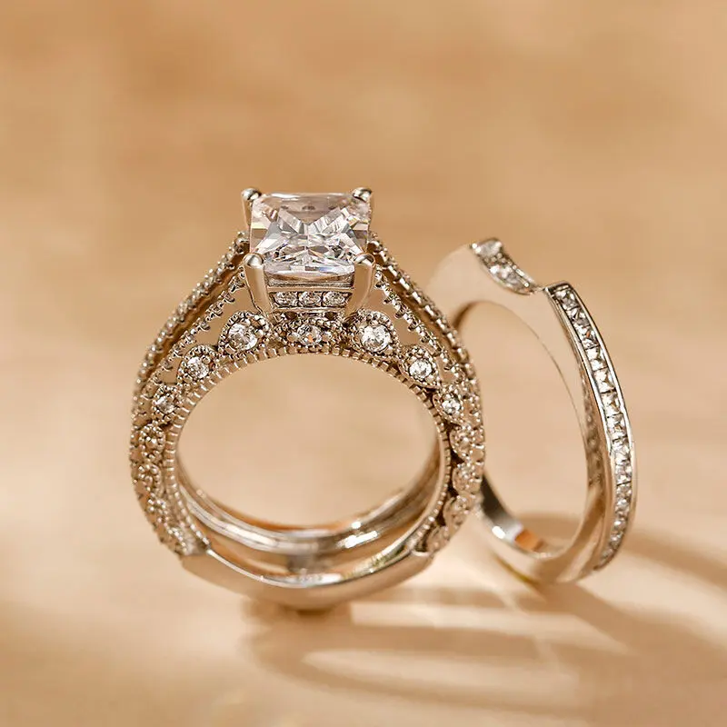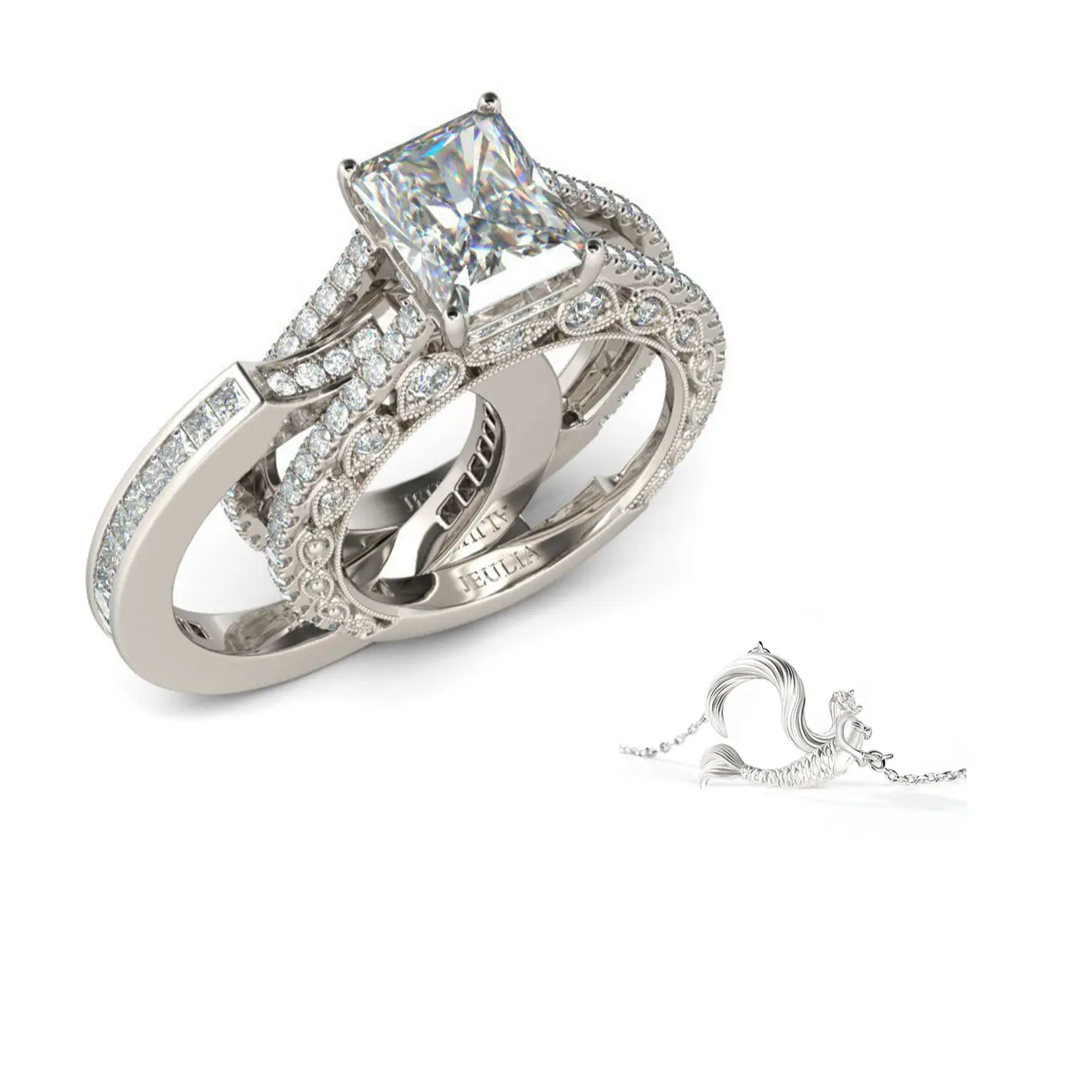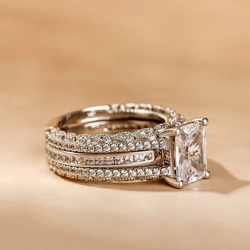 ✿Inspiration✿: This eye-catching interchangeable ring set features an enchanting radiant cut stone and rows of smaller stones embellish the engagement ring in profile. Milgrain detailing along the ring's shank adds depth and dimension to this elegant design. Additional stones are set into the matching band. Gleaming with your love, this slender wedding set is a true reminder of your everlasting love.