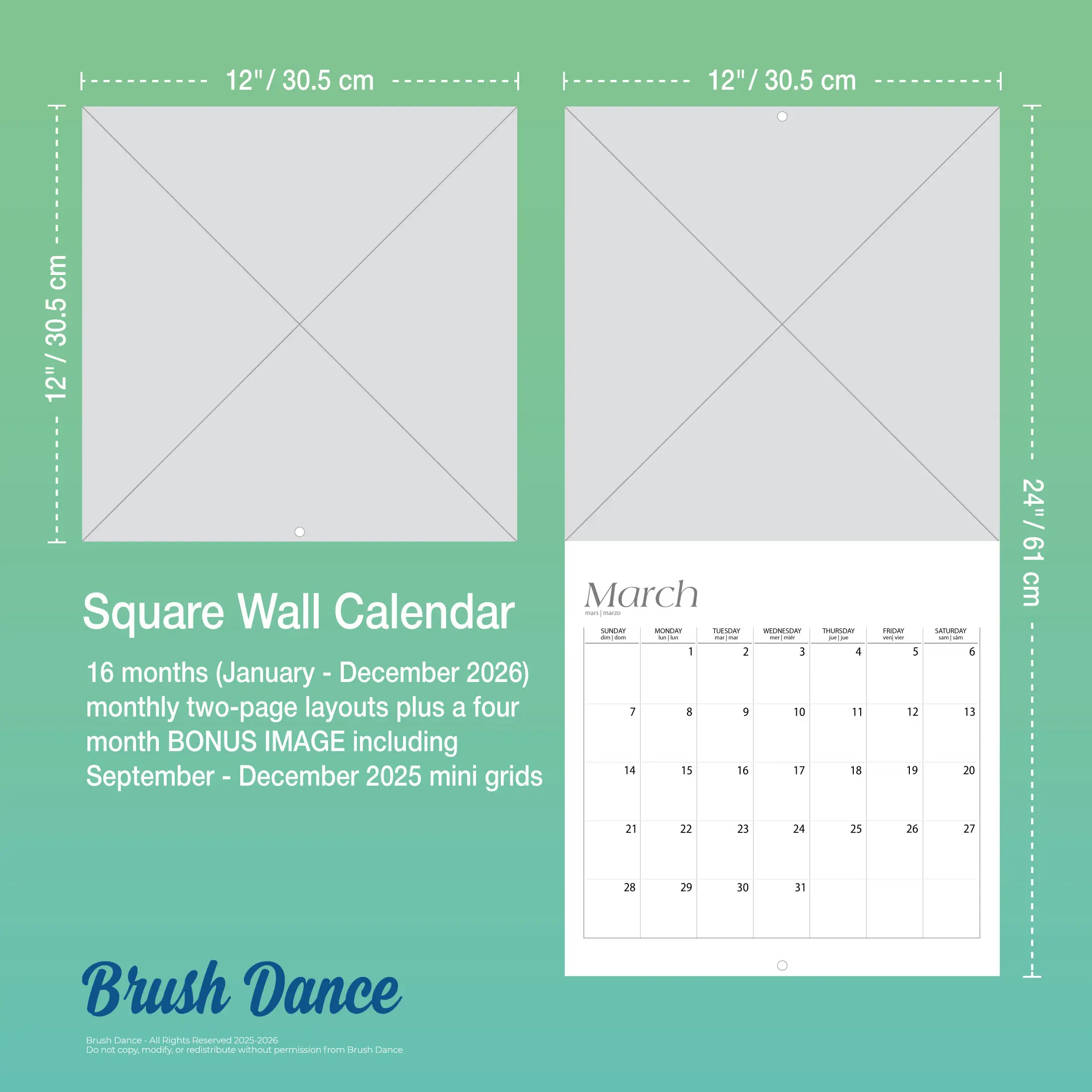 ·Specifications – 16 months (January–December 2026) monthly two-page layouts plus a four month BONUS IMAGE including September–December 2025 mini grids; 12" x 12" (closed); 12" x 24" (opened); 28 pages