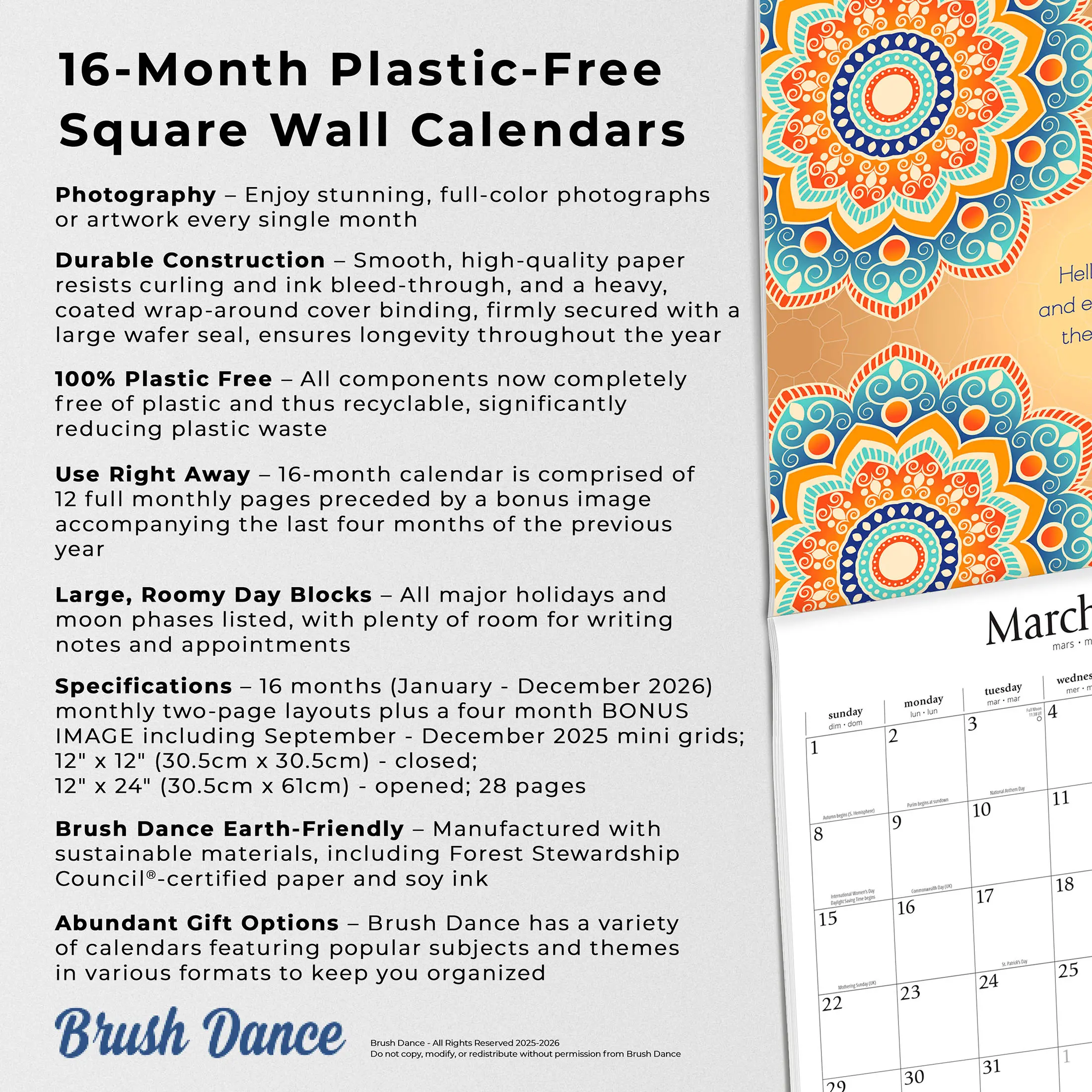 Now 100% free of plastic and completely recyclable, this newly re-designed square wall calendar is an even better way to bring stunning photos and graphic art into your home, or as a gift for your favorite person. The new and improved 12" x 12" calendar is bound in a distinctive wrap-around cover made of an even heavier-duty stock paper than before. This protective packaging surpasses plastic wrap while being far friendlier to the planet.