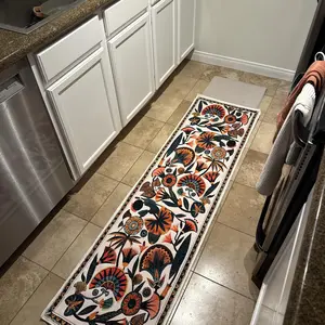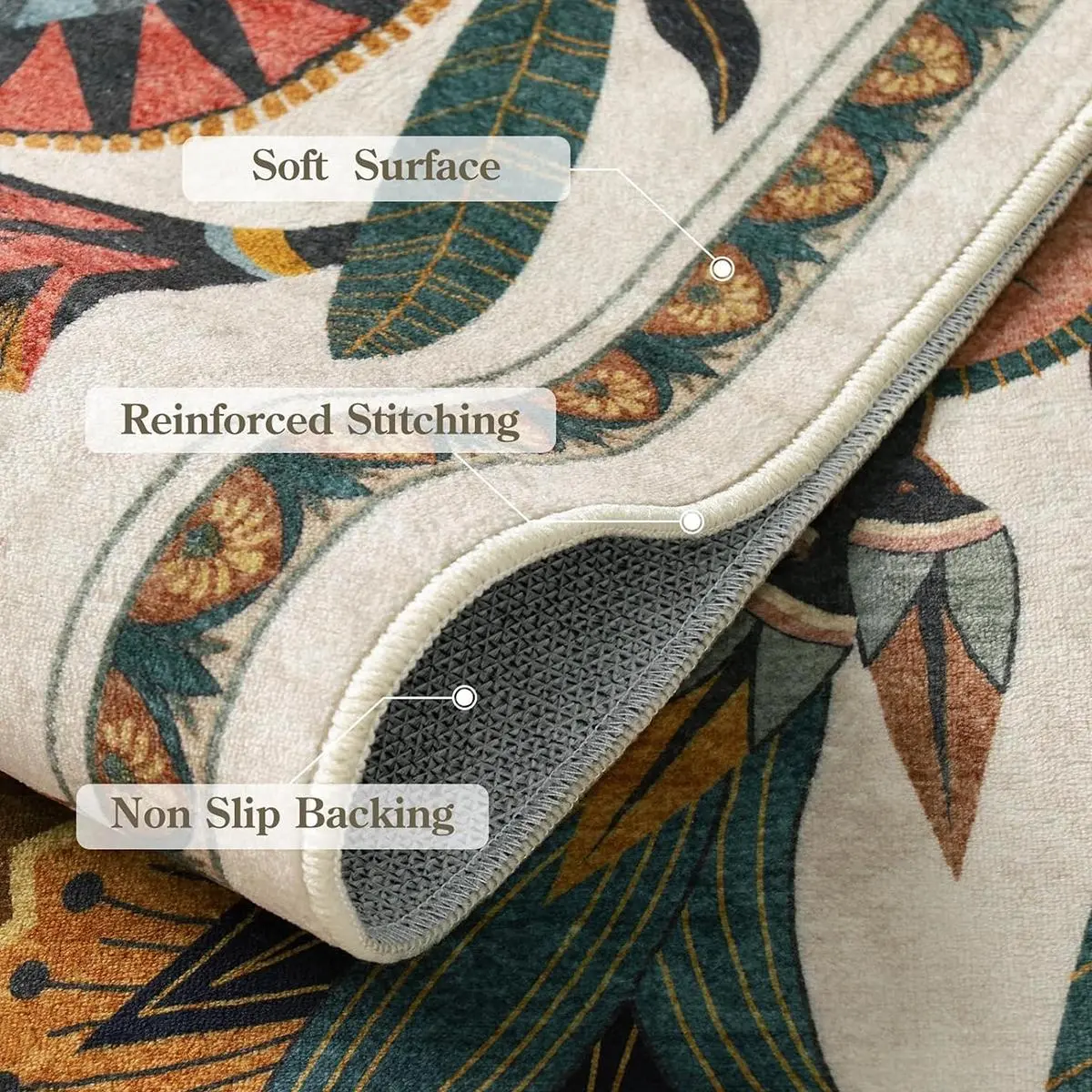 SUPER SOFT! I am really impressed with the quality of this rug!! Brightened up this space in my kitchen. Non slip backing makes it easy to vacuum.