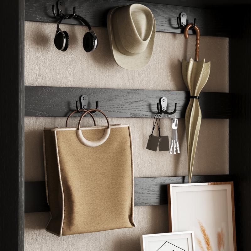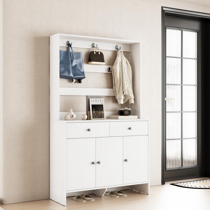 This shoe cabinet has a combined structure with an upper open section featuring several hooks. These hooks are perfect for hanging bags, hats, and scarves, helping to neatly organize entryway essentials.