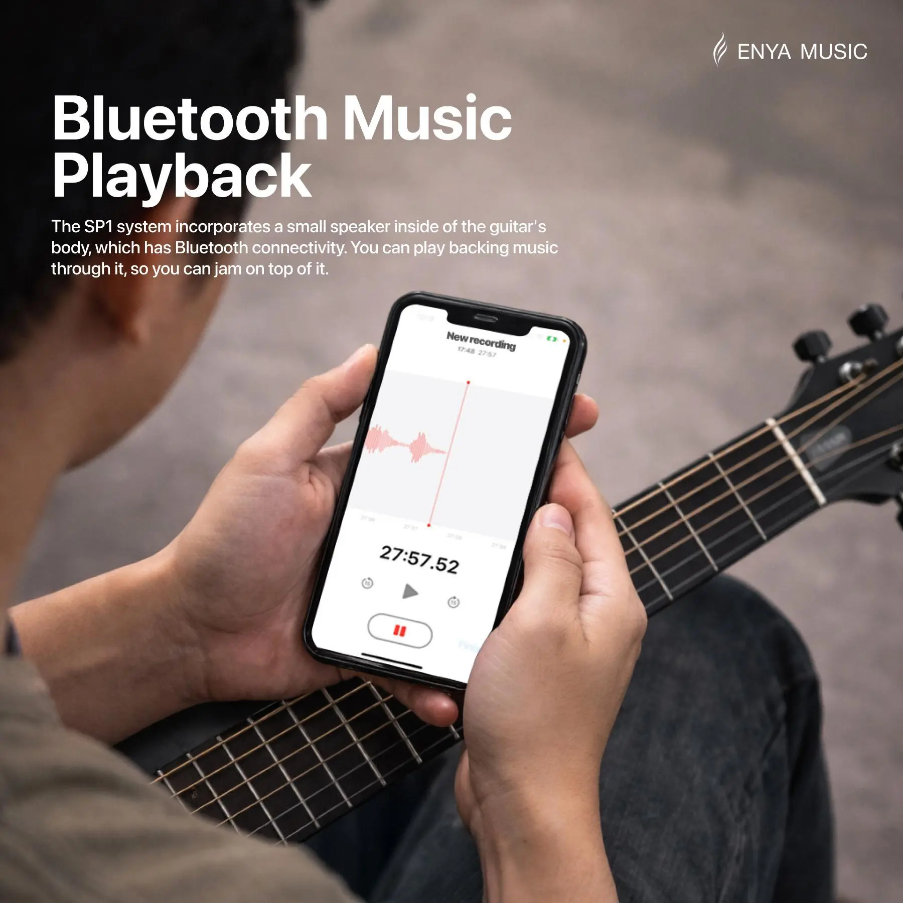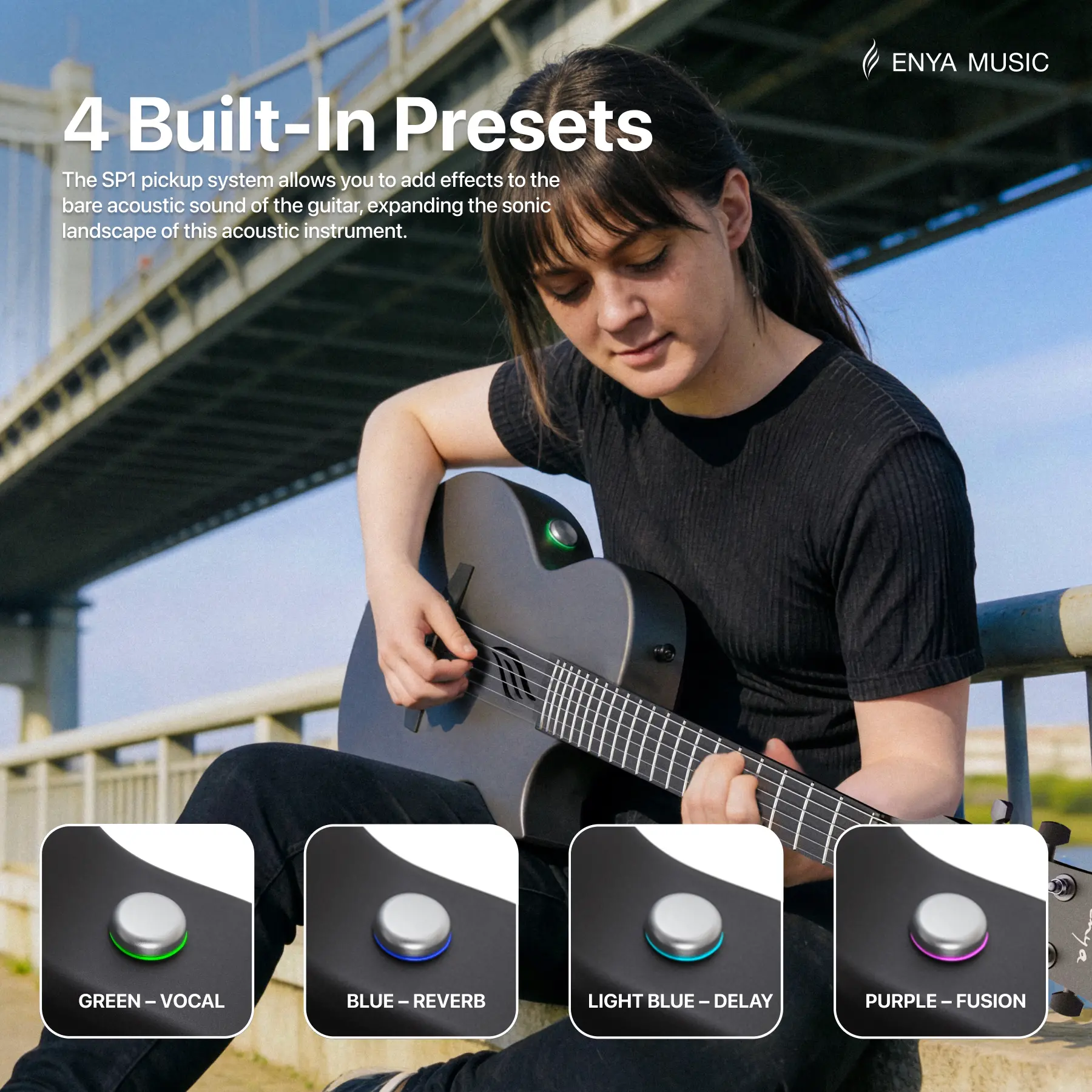 ·WHERE THINGS GET INTERESTING - The absolute differentiator of this guitar is that it’s equipped with the SP1 pickup system. It gets you reverb, delay, and fusion effects on your bare guitar, unplugged. No pedals nor amps are needed. There’s a little speaker inside the body of the guitar, which produces these effects sound, and it can be also used for music playback via Bluetooth.