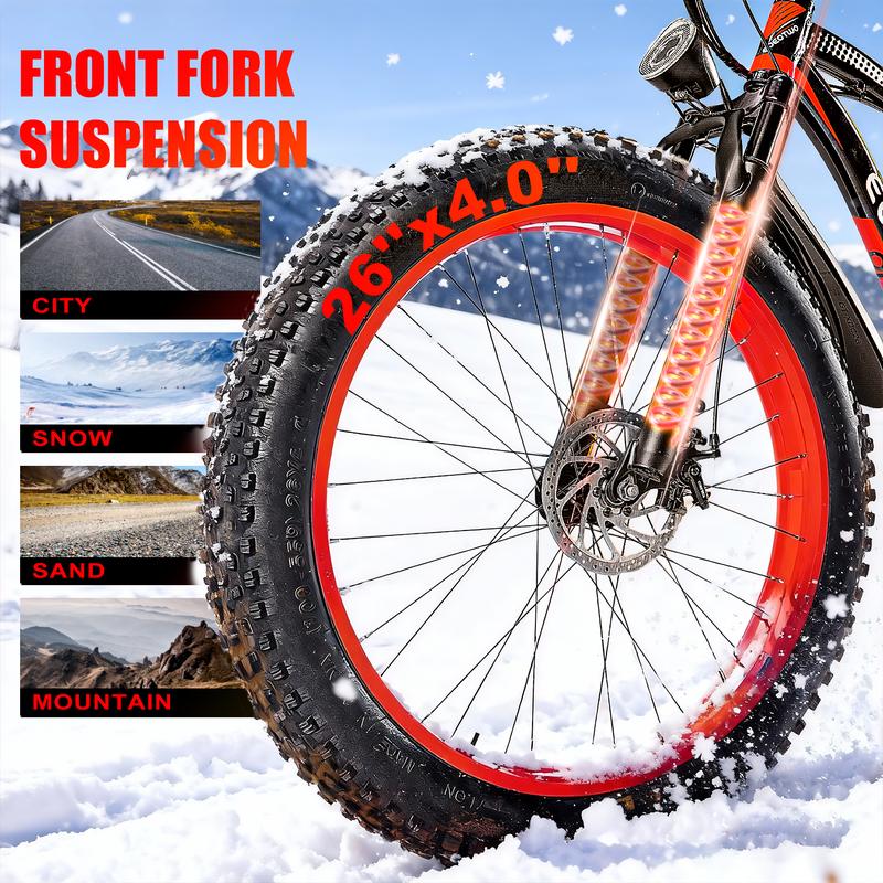 Comfort and Design- Front Shock Absorber System: Enhances riding comfort.- Vacuum-Sealed Seats: Provide soft support for long rides.- 26-inch x 4.0-width Rubber Tires: Ensure excellent grip and stability.