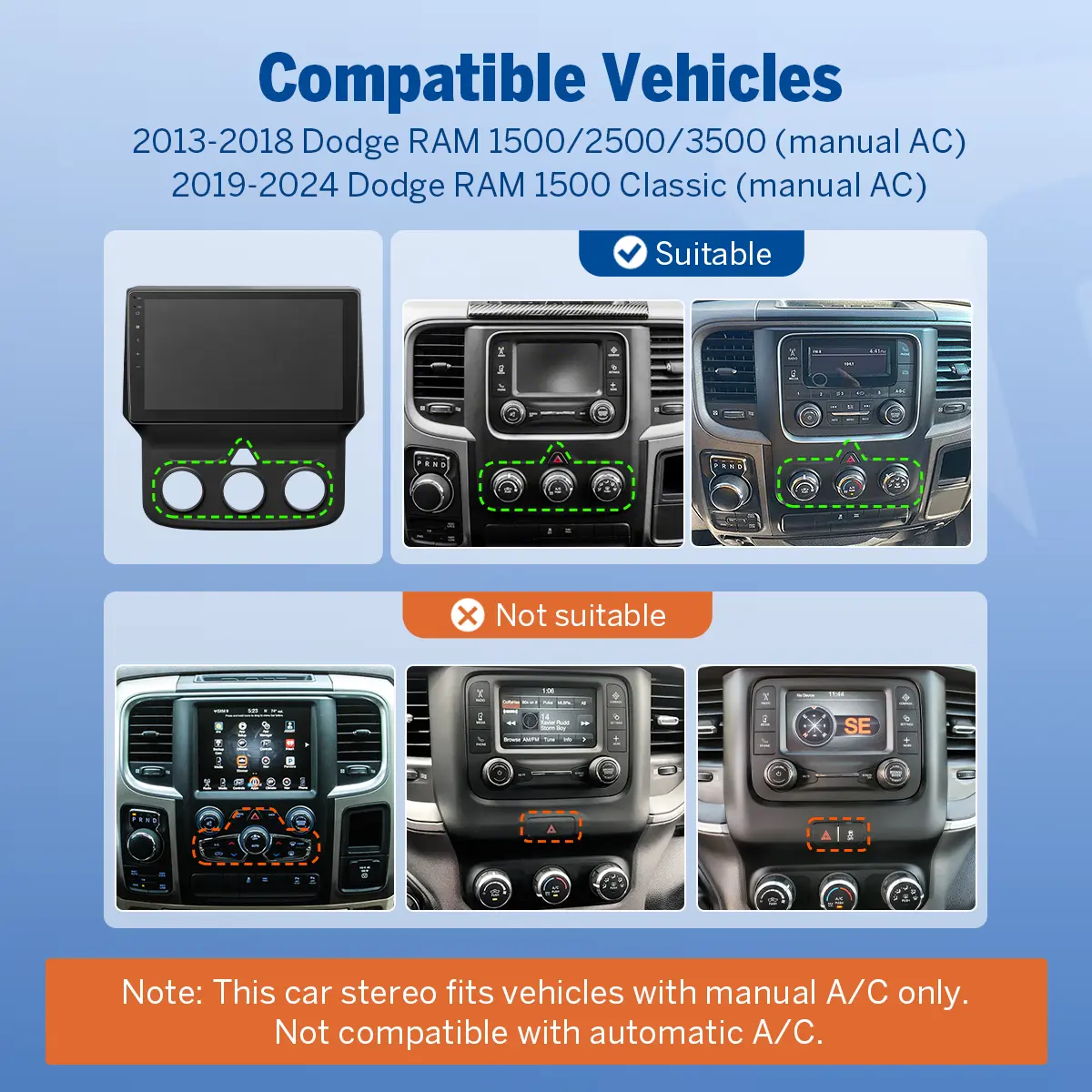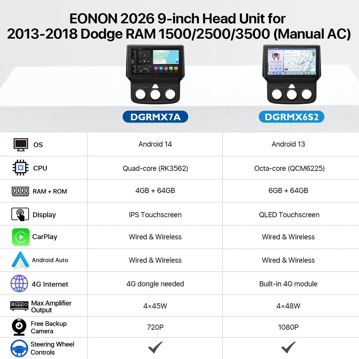 EONON DGRMX7A/DGRMX6S2 Car Stereo for Dodge RAM 1500 2500 3500 (2013-2018) [Manual AC edition] and 2019-2024 Dodge RAM 1500 Classic [Manual AC edition]