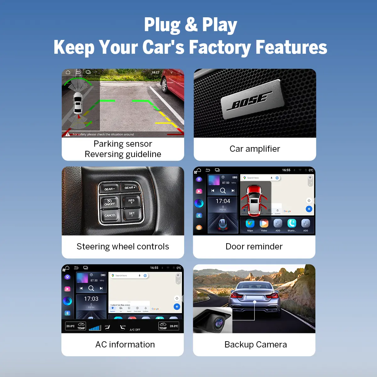 Seamlessly preserves steering wheel controls, door reminders, AC display & controls, seat heating, parking sensors, reversing lines, and the original car amplifier.