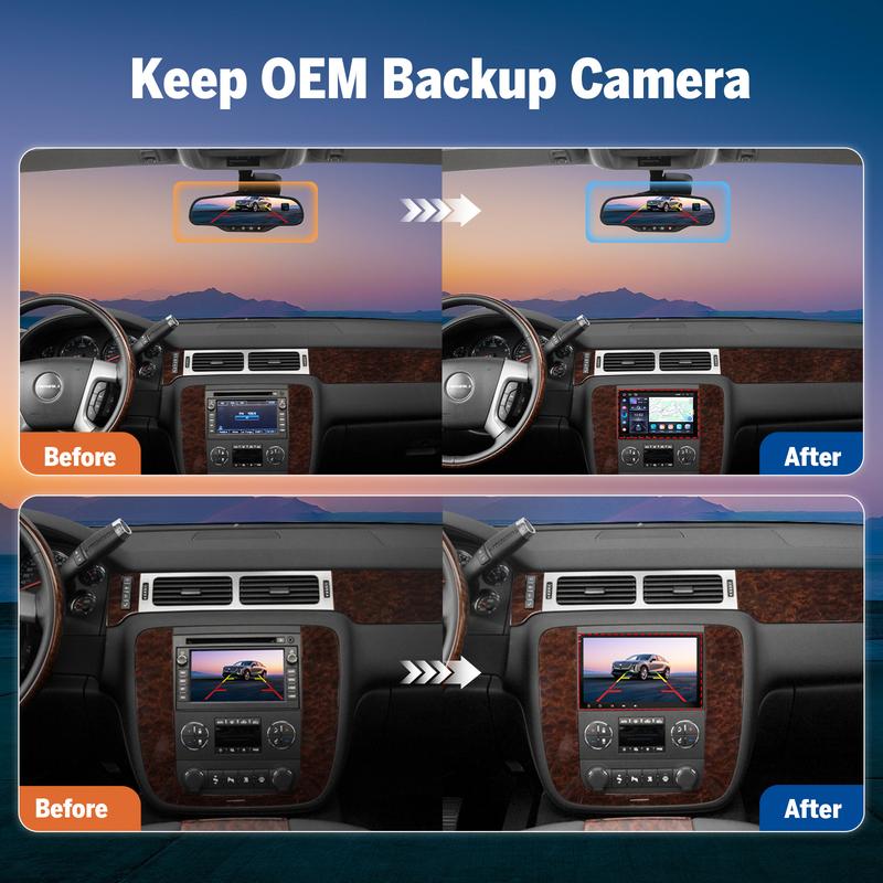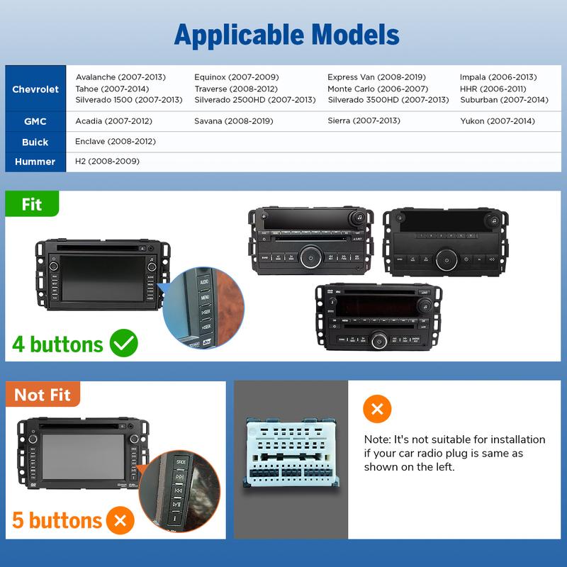 ·【Plug & Play】GMX7/GMX7A(GMA13 head unit Upgraded Version) /GMX6S/GMX6S-PRO head unit compatible with Chevrolet Chevy Silverado (2007-2013), Avalanche (2007-2013), Tahoe (2007-2014), Impala (2006-2013), Traverse(2008-2012), Suburban (2007-2012), Express Van (2008-2019), GMC Sierra (2007-2013), Yukon (2007-2014), Acadia (2007-2012), Savana (2008-2019), Buick Enclave (2008-2012). No additional frame or cable changes are needed. Equipped with CANBUS, it supports most original functions including SWC, Bose system, OnStar, door Information, stock backup camera, etc. If you want to keep the factory rear-seat entertainment, an Eonon A506 USB to RCA video output adapter converter (not included) is required. You can find it in our shop.