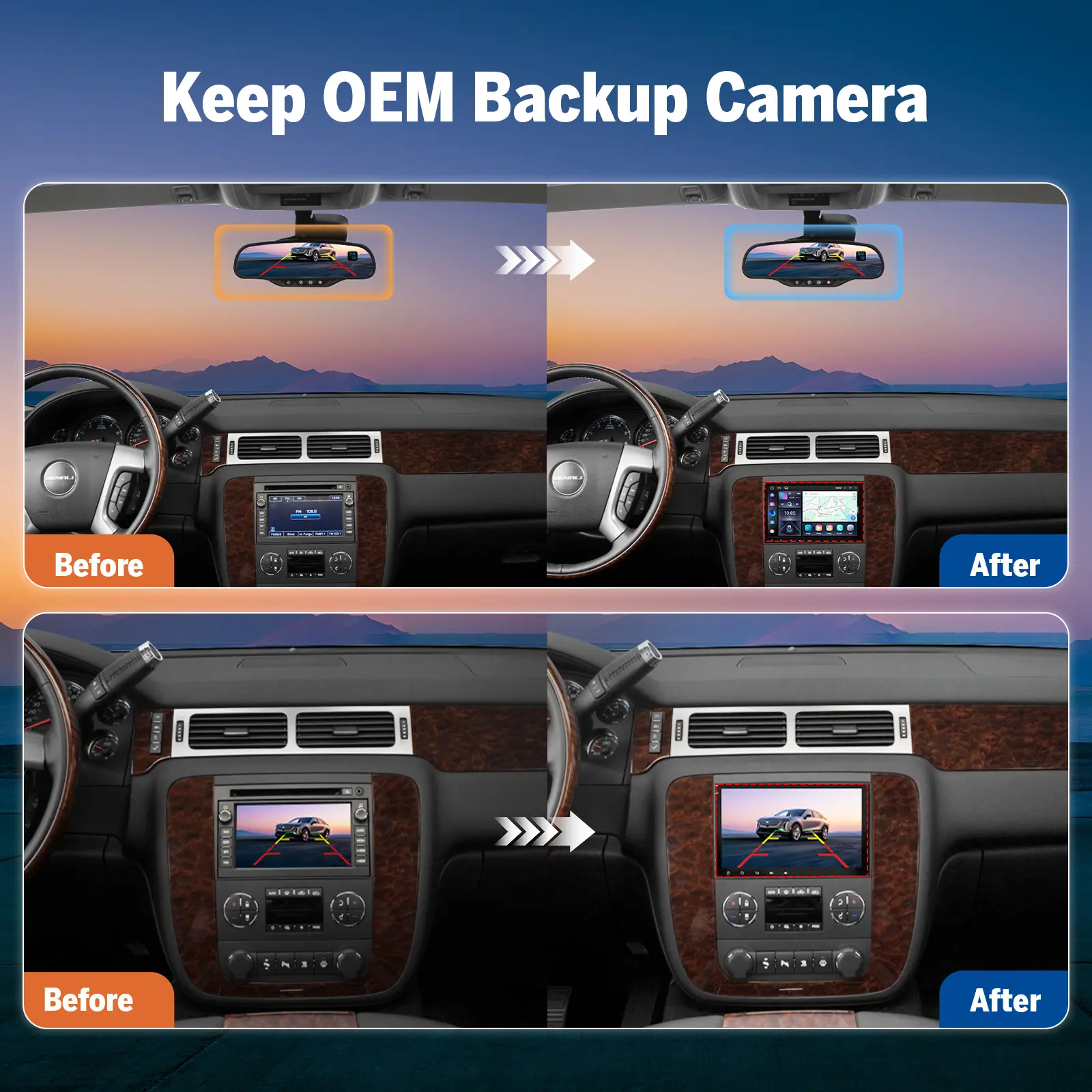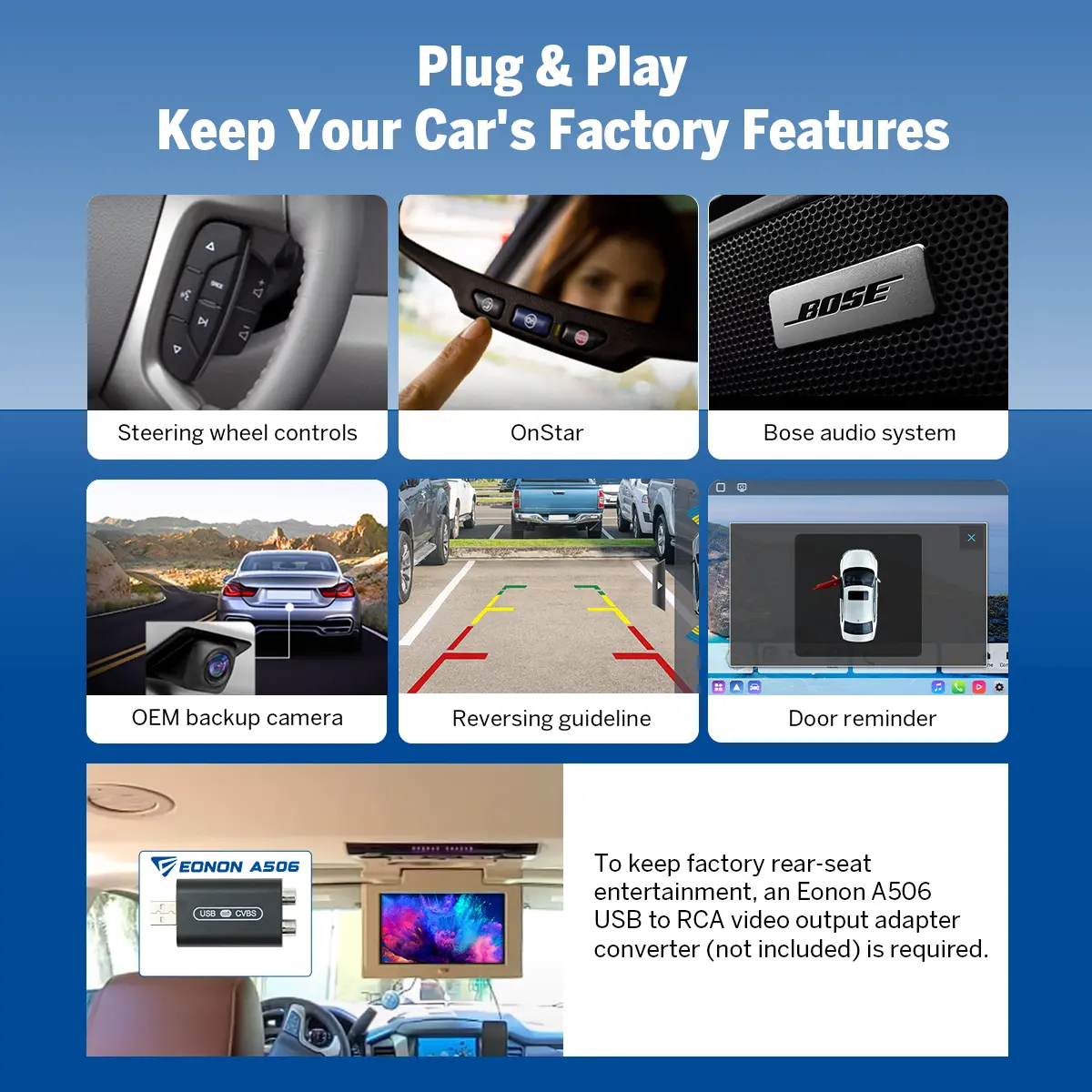 ·【Plug & Play】GMX7A(GMA13/GMX7 head unit Upgraded Version) /GMX6S/GMX6S-PRO head unit compatible with Chevrolet Chevy Silverado (2007-2013), Avalanche (2007-2013), Tahoe (2007-2014), Impala (2006-2013), Traverse(2008-2012), Suburban (2007-2012), Express Van (2008-2019), GMC Sierra (2007-2013), Yukon (2007-2014), Acadia (2007-2012), Savana (2008-2019), Buick Enclave (2008-2012). No additional frame or cable changes are needed. Equipped with CANBUS, it supports most original functions including SWC, Bose system, OnStar, door Information, stock backup camera, etc. If you want to keep the factory rear-seat entertainment, an Eonon A506 USB to RCA video output adapter converter (not included) is required. You can find it in our shop.