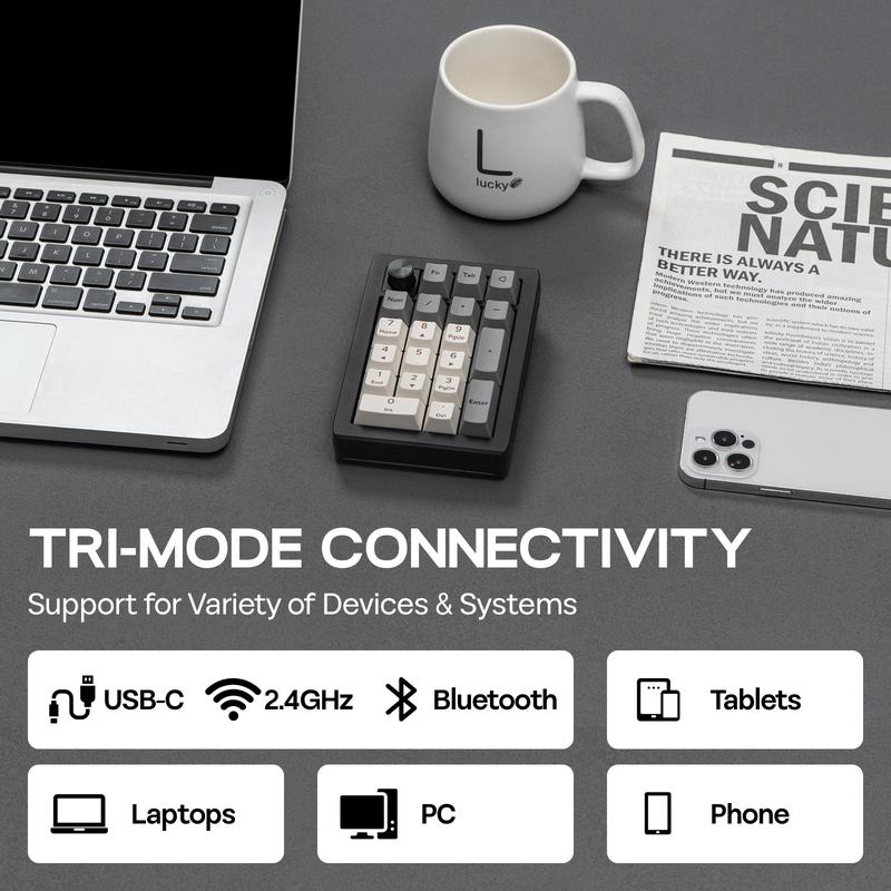 Triple Modes&1000mAh Large Capacity Battery: The EK21 offers exceptional versatility with its triple connectivity options. Choose from wired, Bluetooth, or 2.4GHz wireless modes to suit your preferences and enhance your productivity. This numpad is not just about connectivity; it also features a robust 1000mAh battery capacity, providing you with extended usage time without the inconvenience of frequent recharging. Enjoy consistent performance and stay focused on your tasks throughout the day, knowing that the EK21 is designed to keep up with your demands. Whether you're working at your desk or on the go, this device ensures seamless operation tailored to your needs